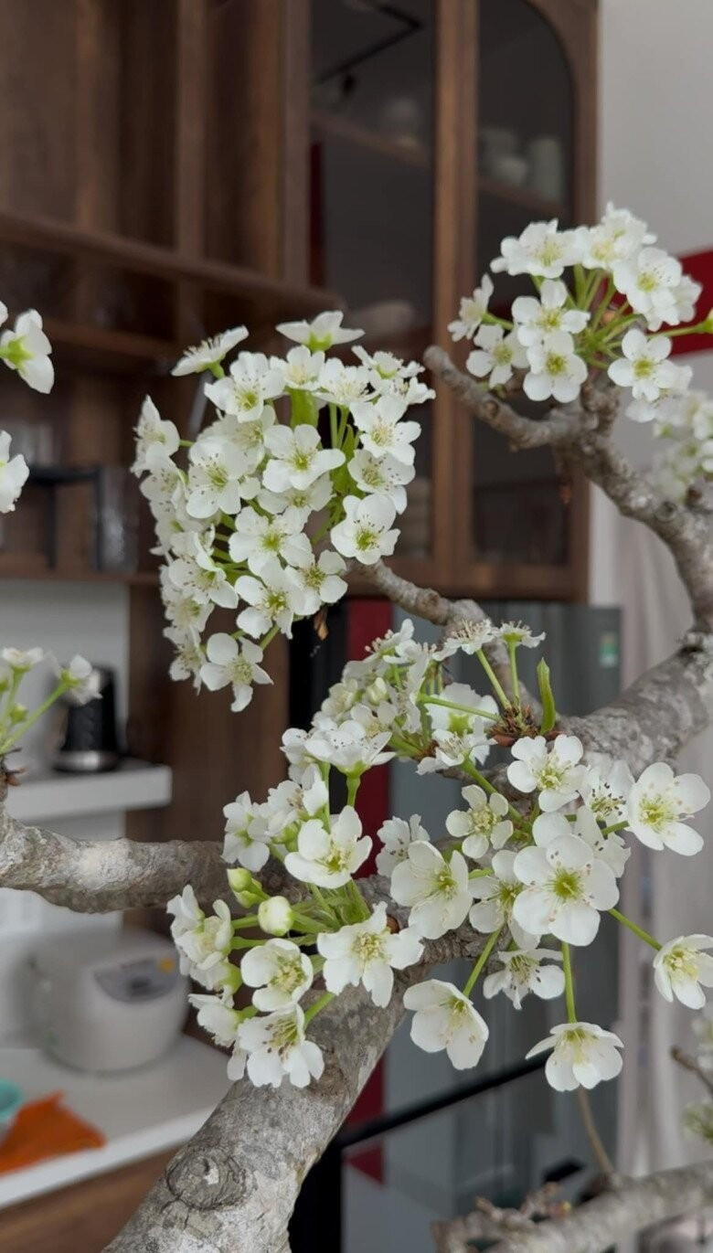 Khu bếp cũng ngập tràn sắc trắng của hoa lê. Ảnh chụp màn hình