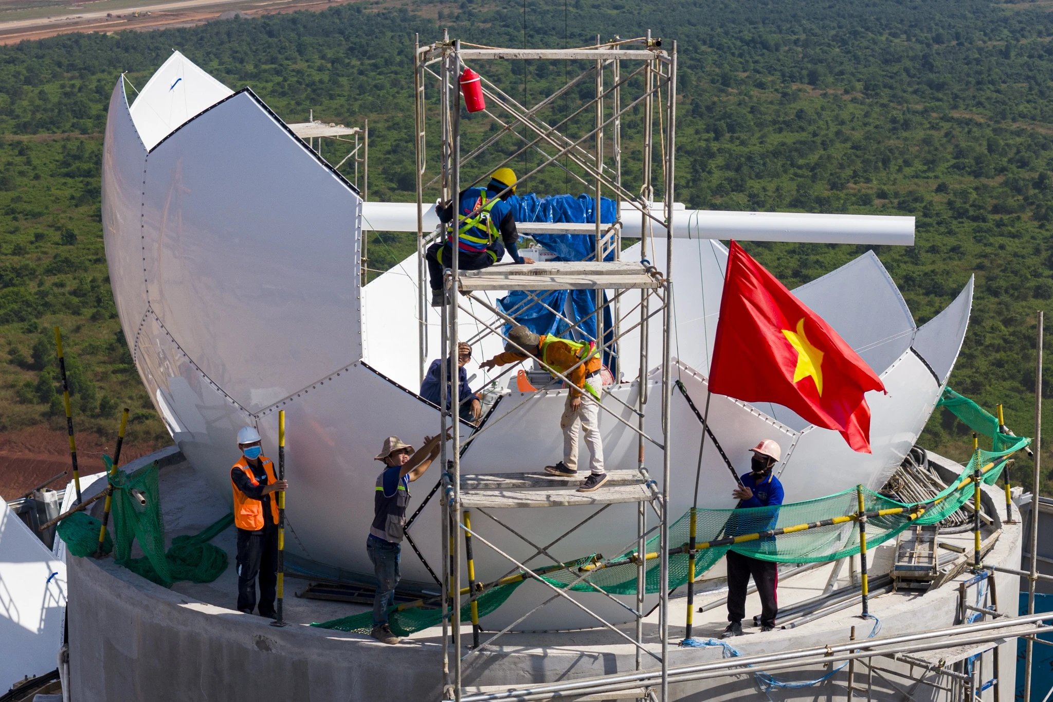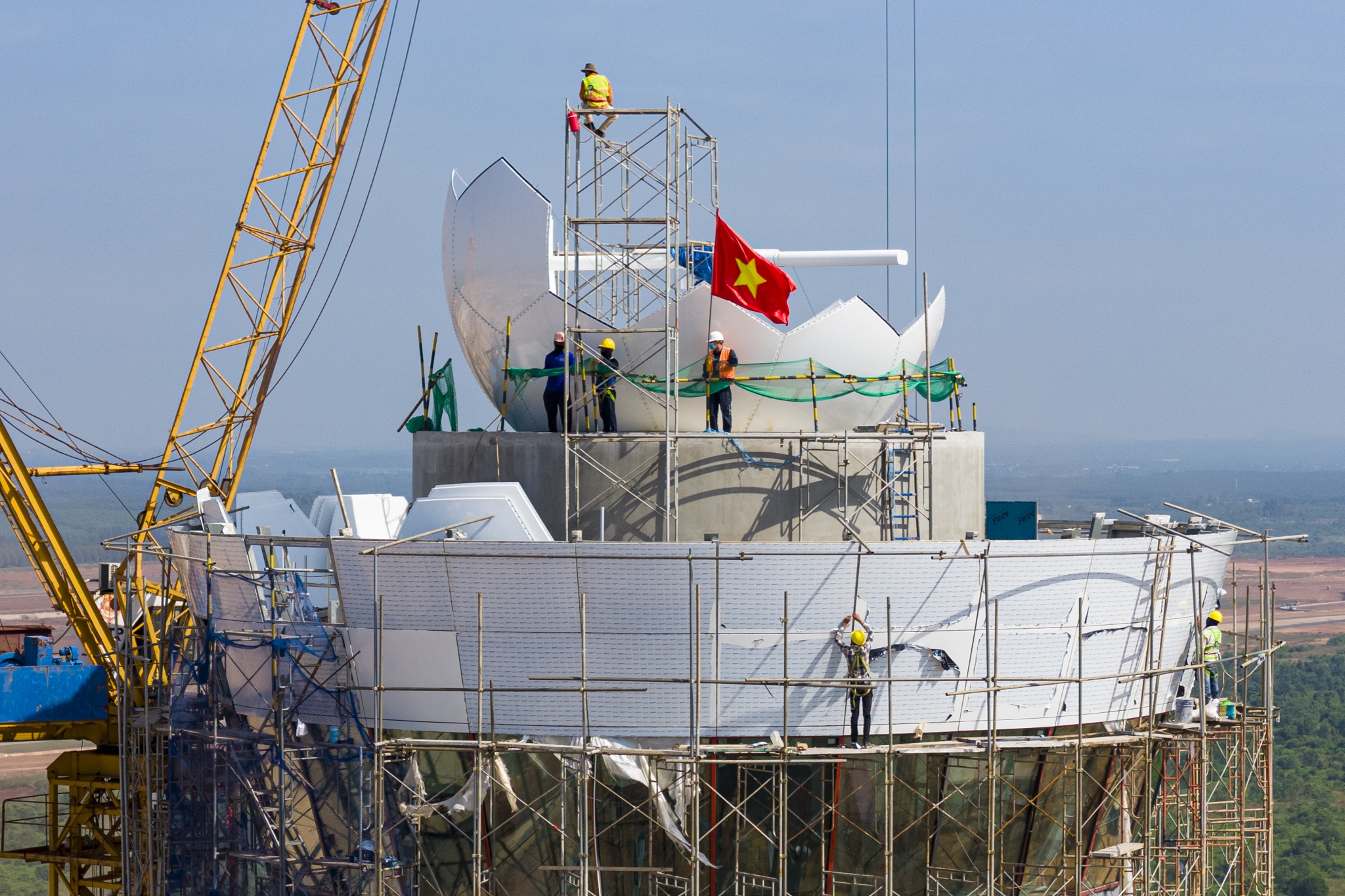 Hạng mục búp sen trên đỉnh tháp đang được các kỹ sư và công nhân gấp rút thi công vào chiều 26/11.