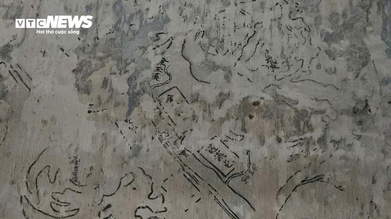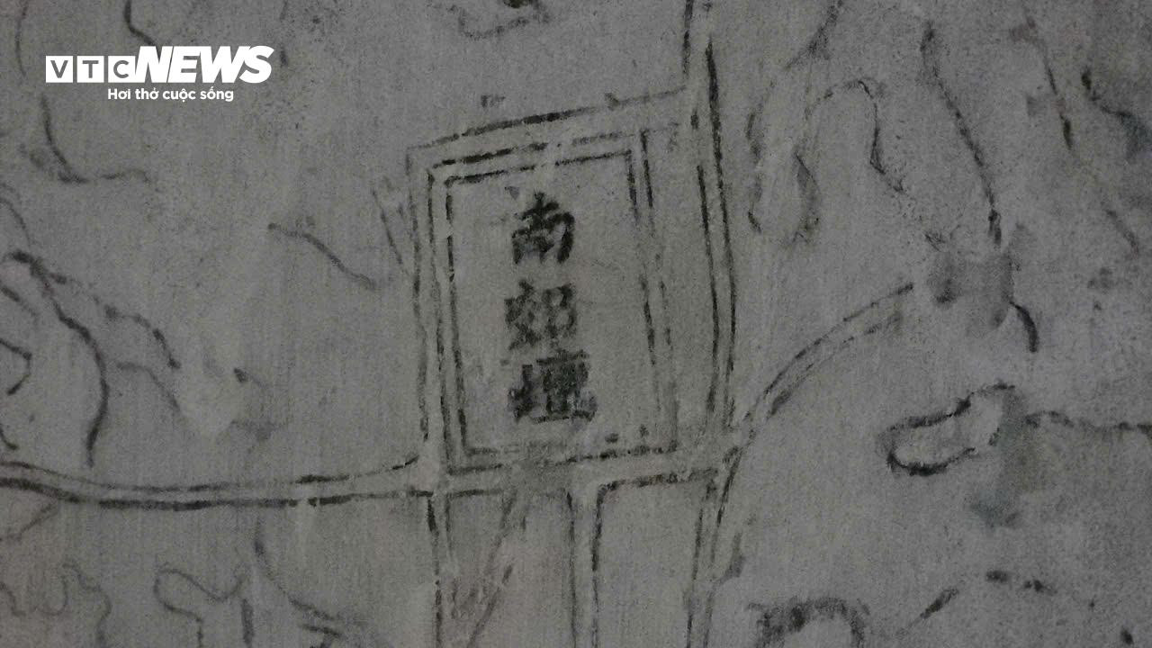 Đặc biệt, phía trên cùng bức họa trên tường có một dòng chữ Hán cỡ lớn nhưng một số chữ bị phai mờ, mất nét theo thời gian.