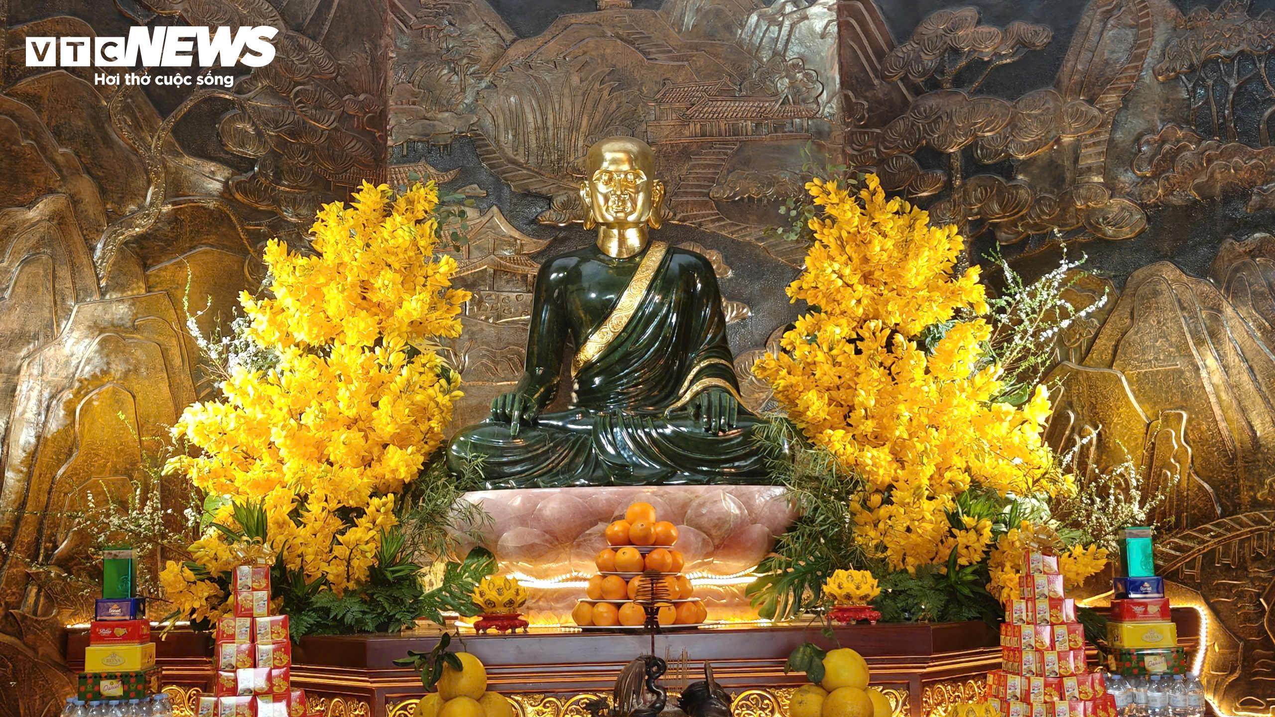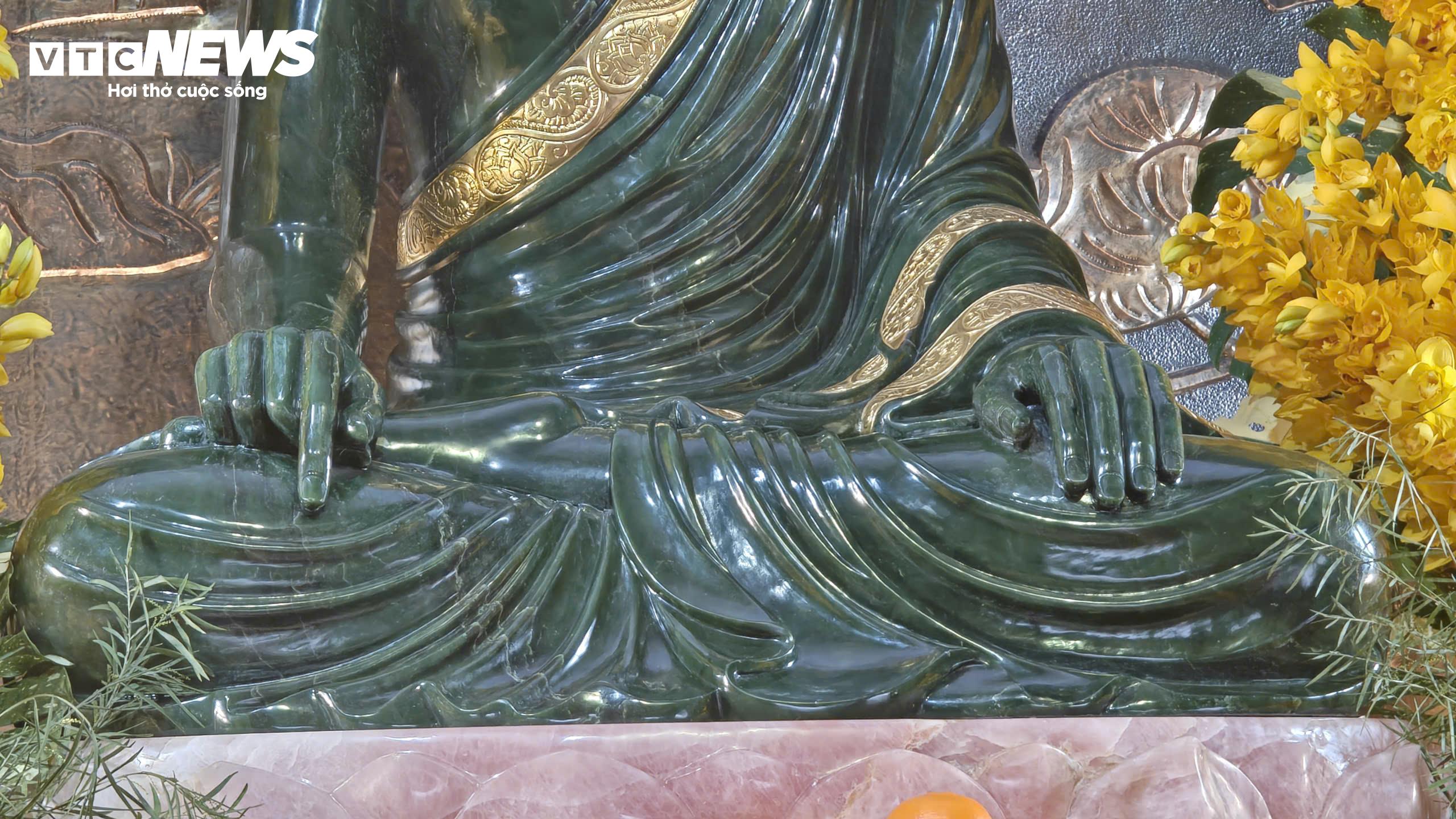Tượng được làm từ khối ngọc bích lớn khai thác từ Canada, một vật liệu quý hiếm, mang lại vẻ đẹp trang nghiêm và thanh tịnh. Tượng cao 156cm, nặng trên 5 tấn, được tạo tác bởi các nghệ nhân đá quý hàng đầu thế giới và Việt Nam, mang đến đường nét hài hòa, tinh tế.