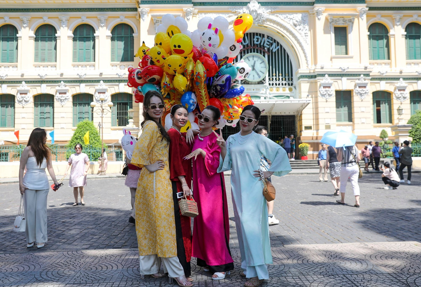 Du khách chụp ảnh lưu niệm trước tòa nhà