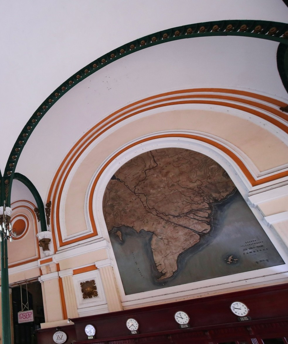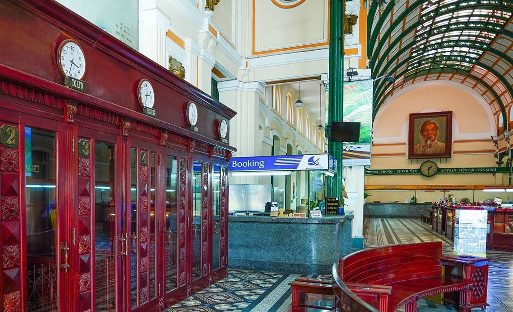Bên trong kiến trúc tòa nhà còn ghi dấu ấn của lịch sử ngành Bưu chính viễn thông như danh sách những nhà phát minh ra ngành điện báo. Hai bên tường cao là 2 bản đồ lịch sử mang tên: Saigon et ses environs 1892 (Sài Gòn và những vùng phụ cận) và Lignes télégraphiques du Sud Vietnam et du Cambodge 1936 (Đường dây điện tín của miền Nam Việt Nam và Cambodia).