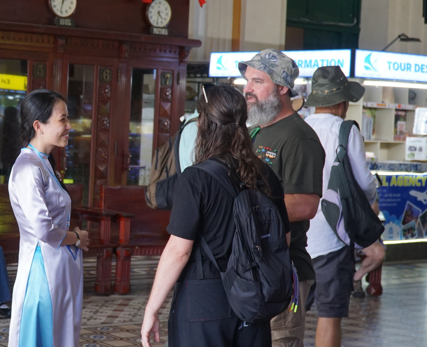 Nhân viên Bưu điện đang hướng dẫn du khách nước ngoài tham quan tòa nhà