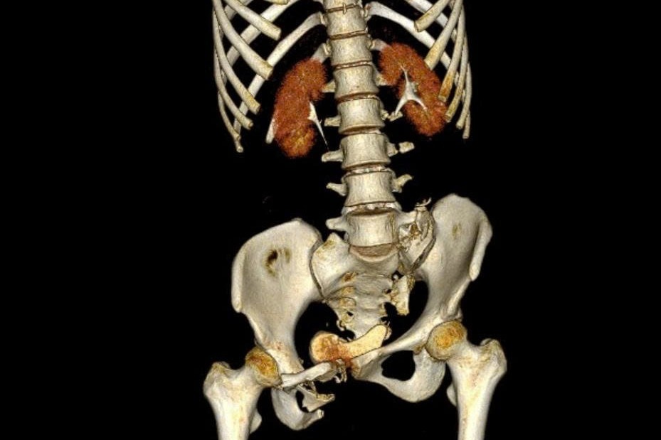 Ảnh chụp CT dựng hình 3D cho thấy bệnh nhân bị dập phổi phải, vỡ bàng quang và buồng trứng phải gây xuất huyết ổ bụng, gãy gai ngang các đốt sống từ L2 đến L5, kèm gãy phức tạp khung chậu kiểu “gió thổi”.
