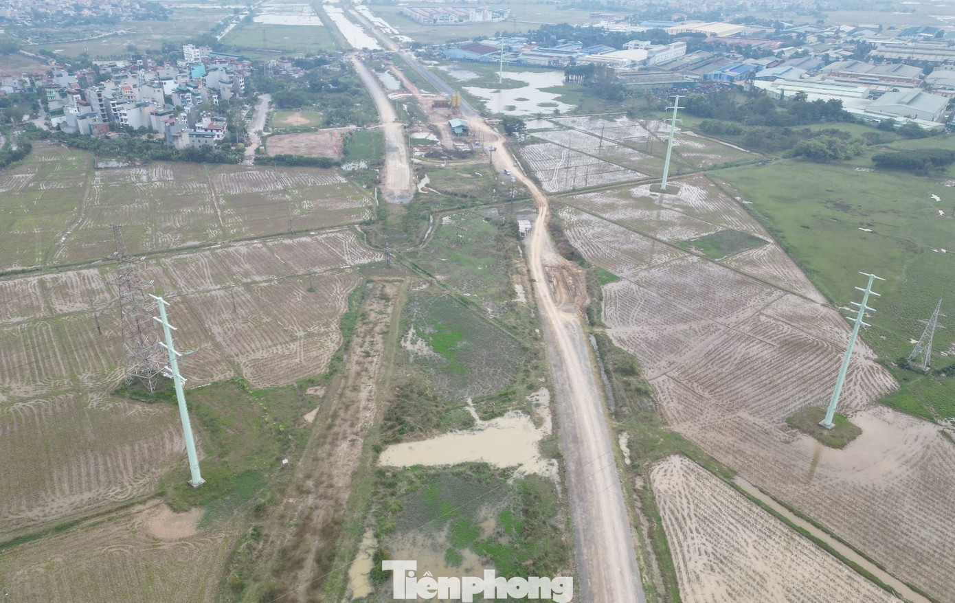 Với đoạn gần nút giao với QL21 (đi Chùa Hương) mặt bằng dự án có đoạn trên vẫn là cột điện cao thế chưa được di dời hoặc hạ ngầm, dưới mặt bằng dự án vẫn là nền đồng ruộng.
