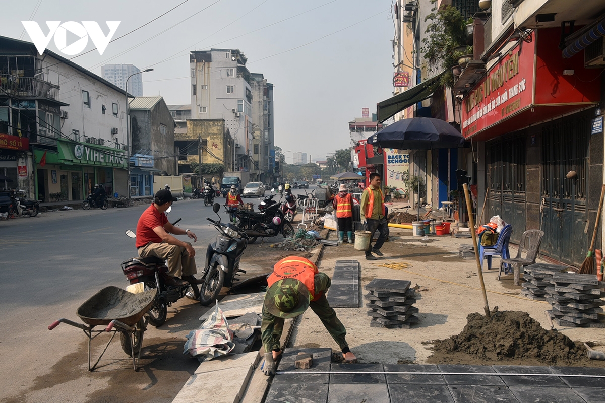 Công nhân đang hoàn tất hạng mục lát vỉa hè tại ngõ 15 Ngọc Hồi.