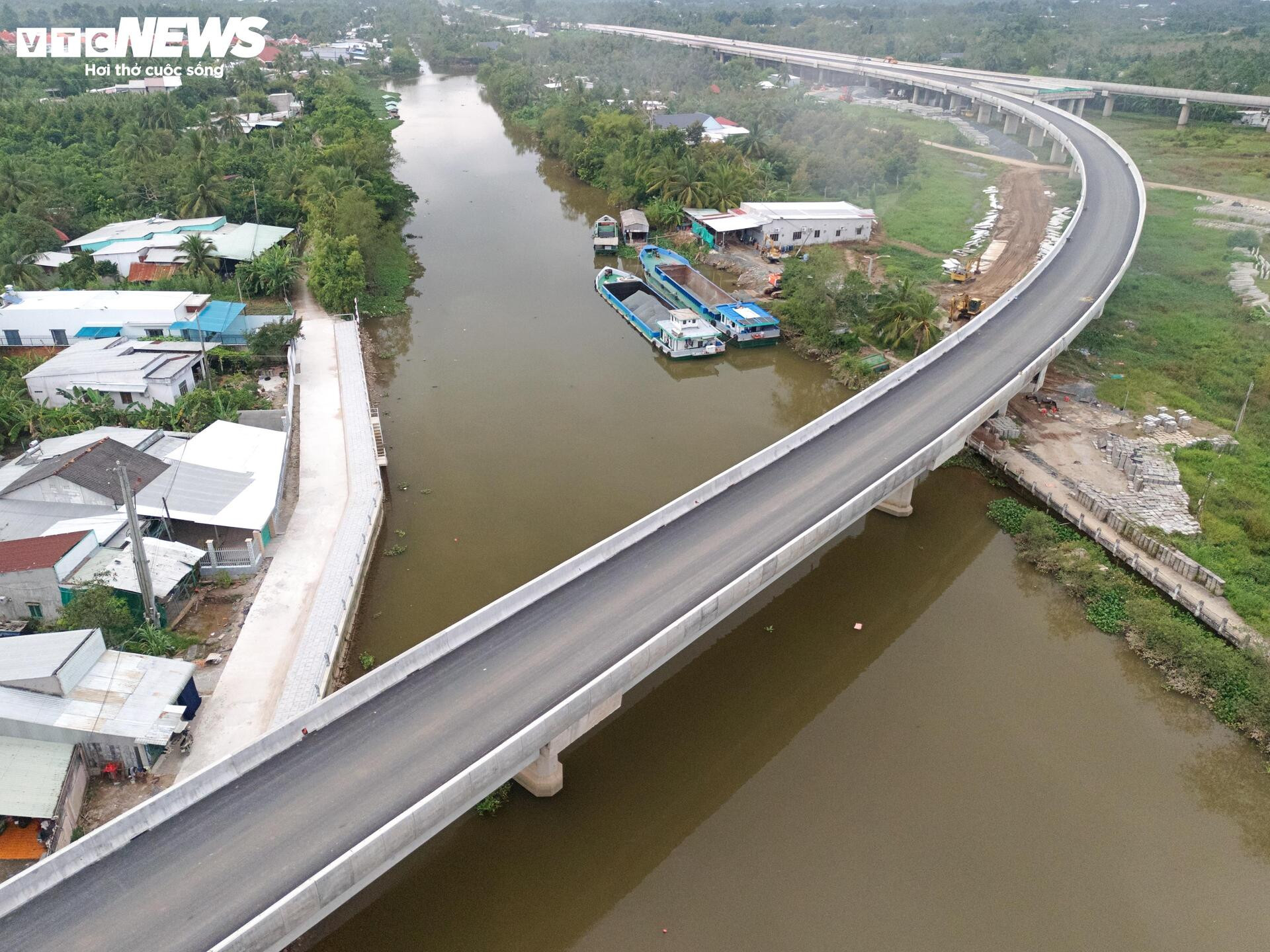 Nút giao hình hoa thị nối cao tốc Cần Thơ – Châu Đốc – Sóc Trăng đã xong dầm cầu và bê tông bản mặt cầu, tuyến chính đang được nhà thầu khẩn trương thảm nhựa.