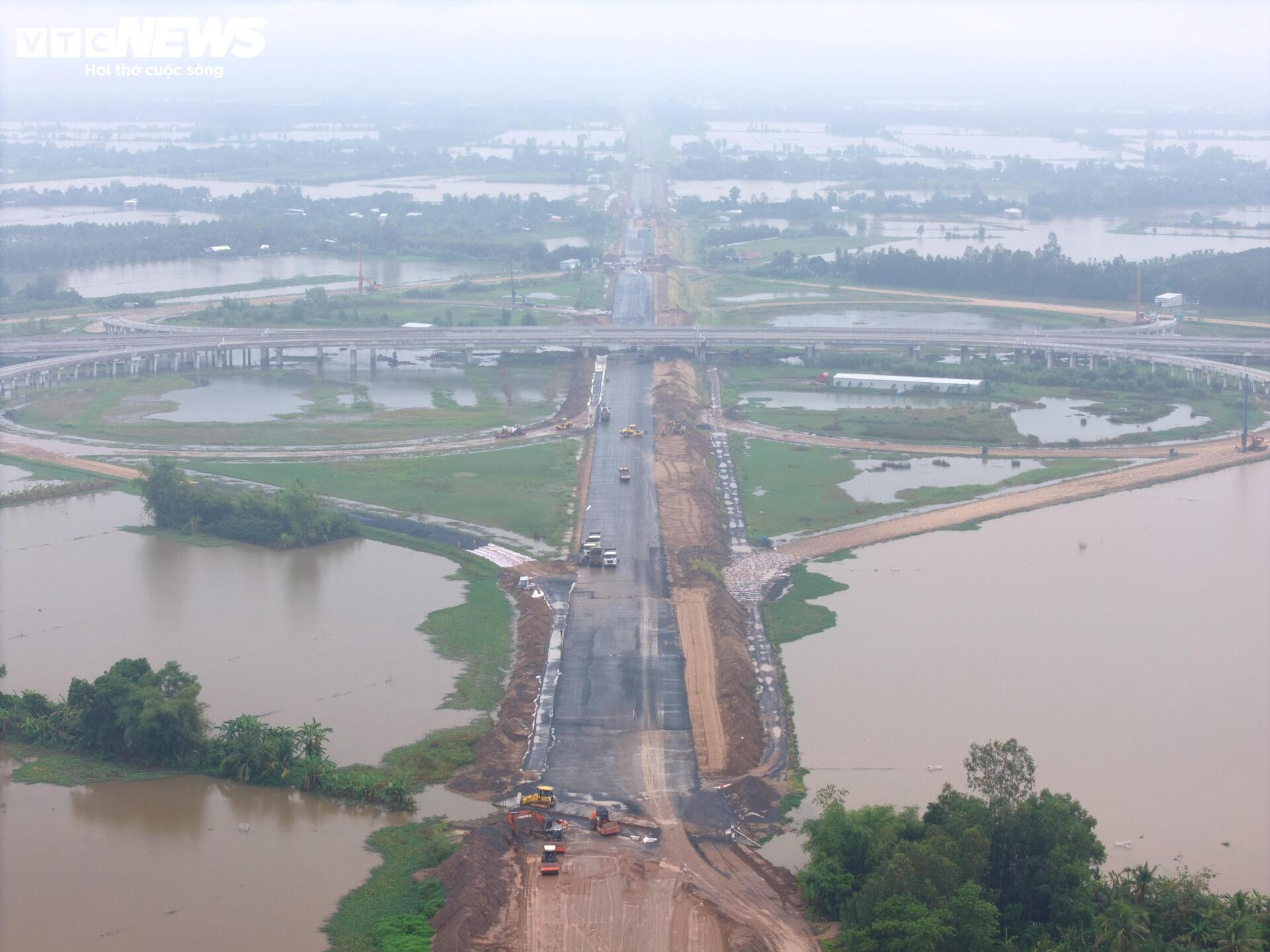 Dù mưa kéo dài, hàng trăm công nhân và máy móc vẫn miệt mài làm việc nhằm đảm bảo tiến độ.