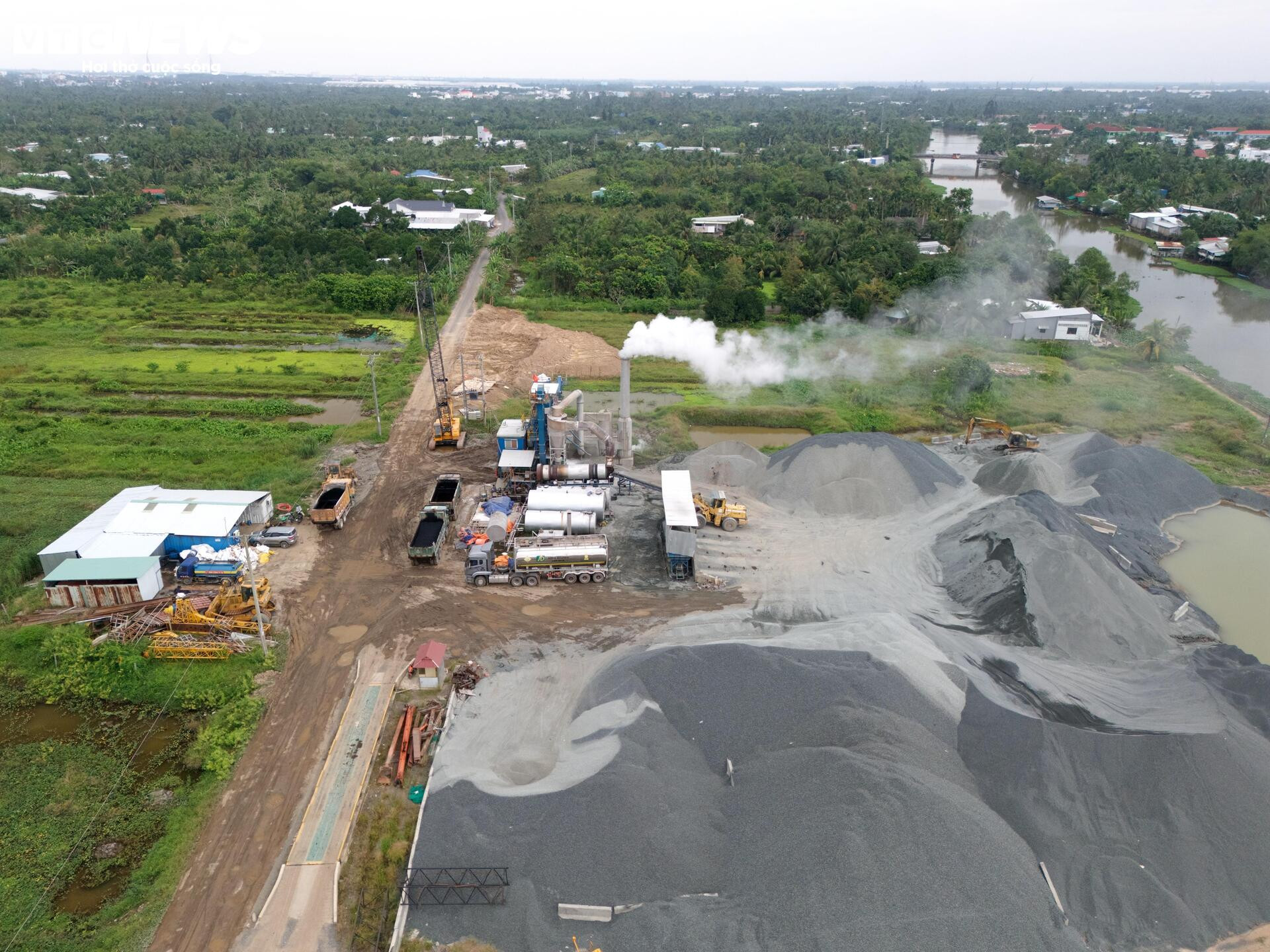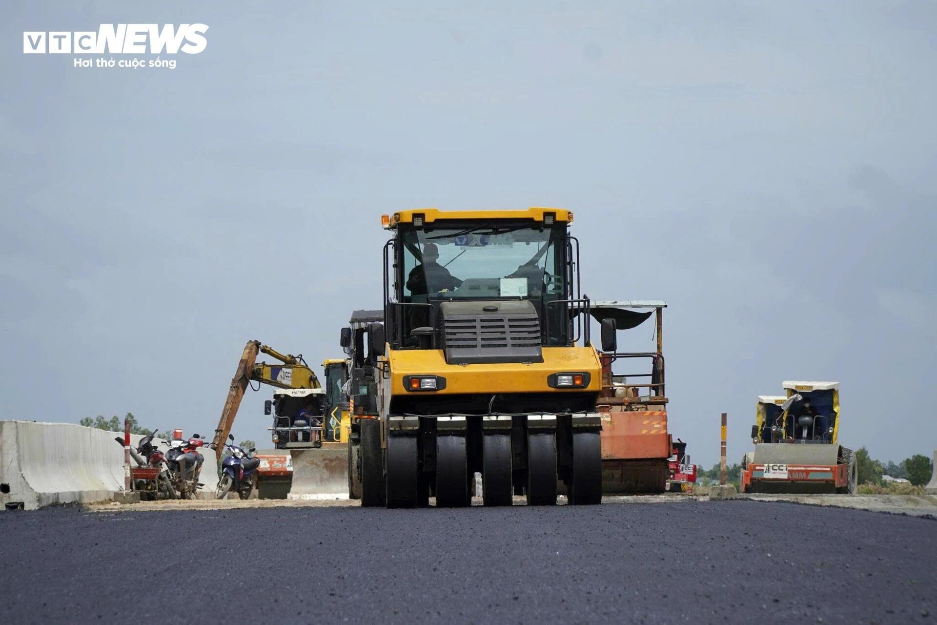 Tại điểm cuối dự án, đoạn qua xã Hồ Thị Kỷ, tỉnh Cà Mau, hàng trăm công nhân cùng máy móc khẩn trương thảm nhựa nền đường khi trời bắt đầu hửng nắng.