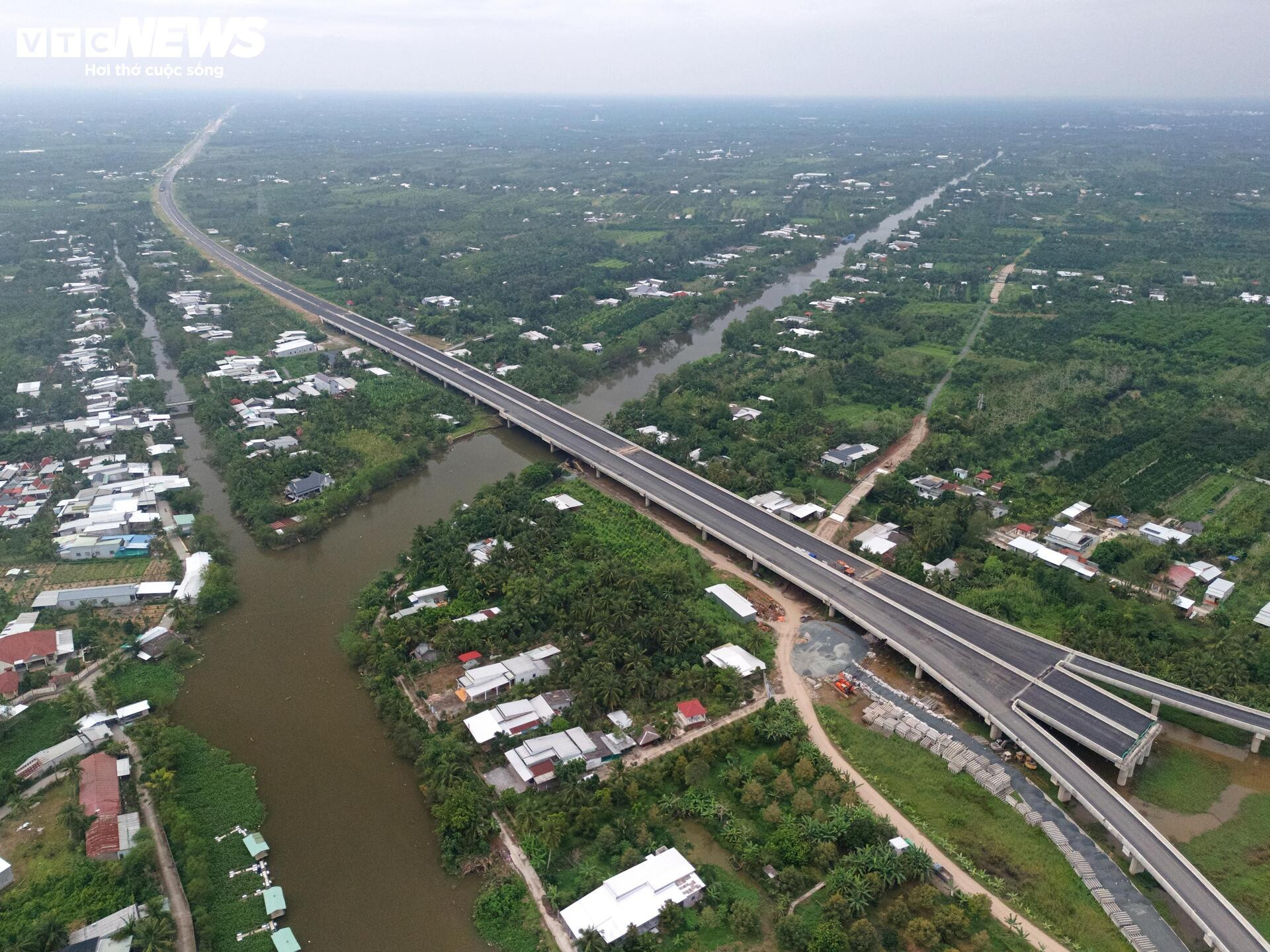 Hạng mục cầu vượt qua Quốc lộ 61 đã hoàn tất thảm nhựa và lắp đặt dải phân cách. Phần đường dẫn hai bên vẫn đang được đắp đất, cấp phối đá dăm để hoàn thiện theo thiết kế.