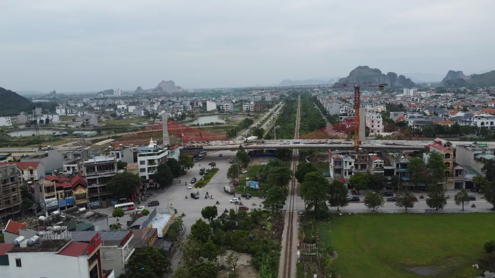 Cầu dây văng vượt tuyến đường sắt Bắc Nam nhìn từ trên cao. Ảnh: ĐẶNG TRUNG