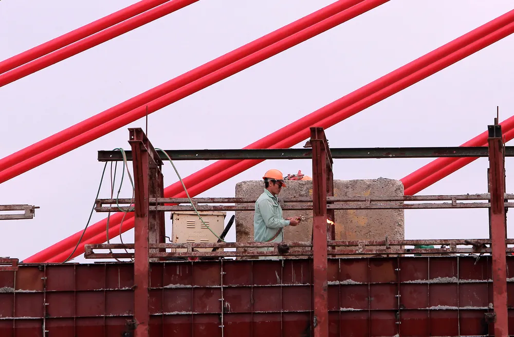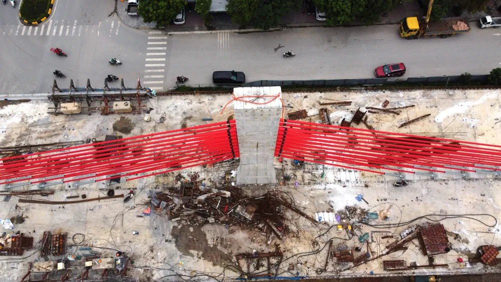 Những sợi cáp như dải lụa đỏ nối thân cầu với trụ tháp kiên cố. Ảnh: ĐẶNG TRUNG
