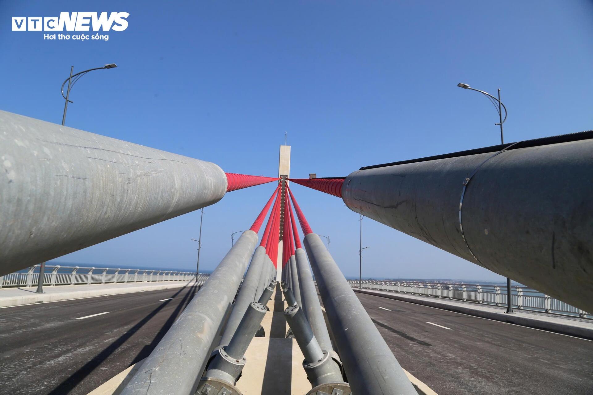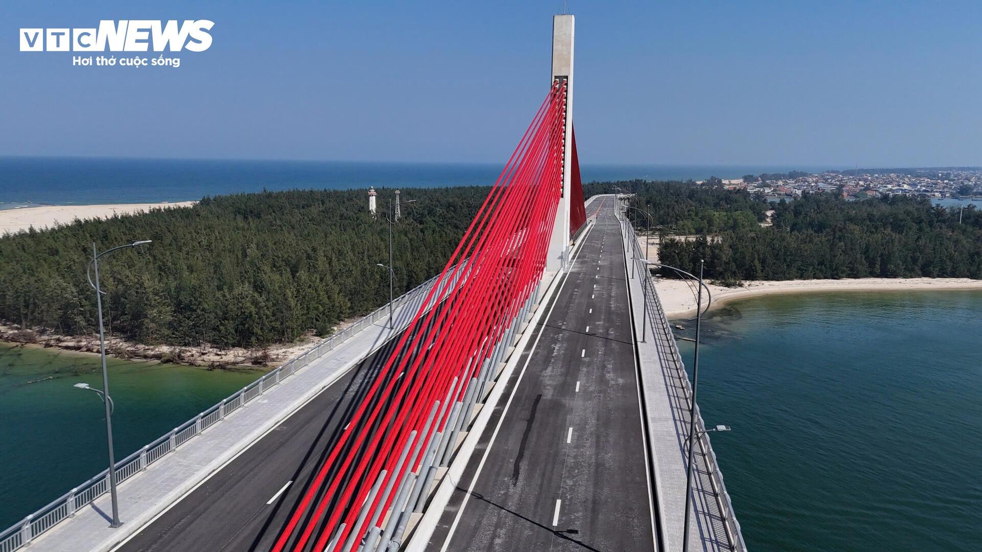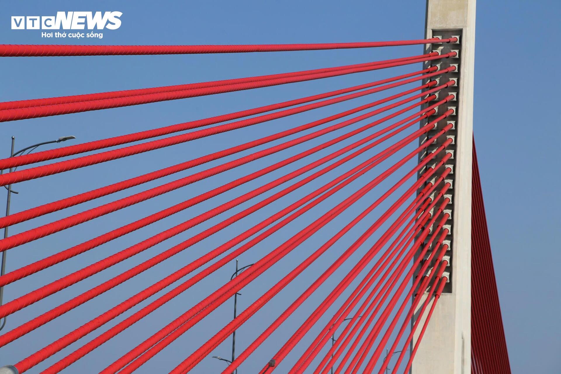 Điểm nổi bật của cây cầu là hệ thống dây văng màu đỏ, neo trên hai trụ chính hình chữ A vươn cao giữa cửa biển.