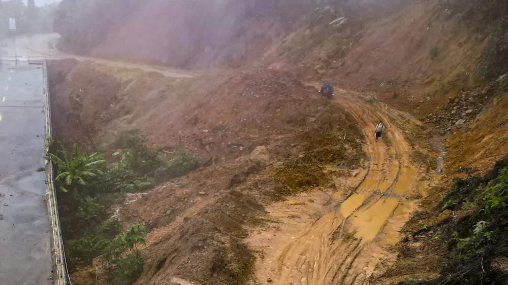Tuy nhiên, do mưa vẫn còn và địa chất yếu, con đường tạm này rất lầy lội, việc di chuyển qua đây gặp vô vàn khó khăn và tiềm ẩn nguy cơ trong những ngày mưa.