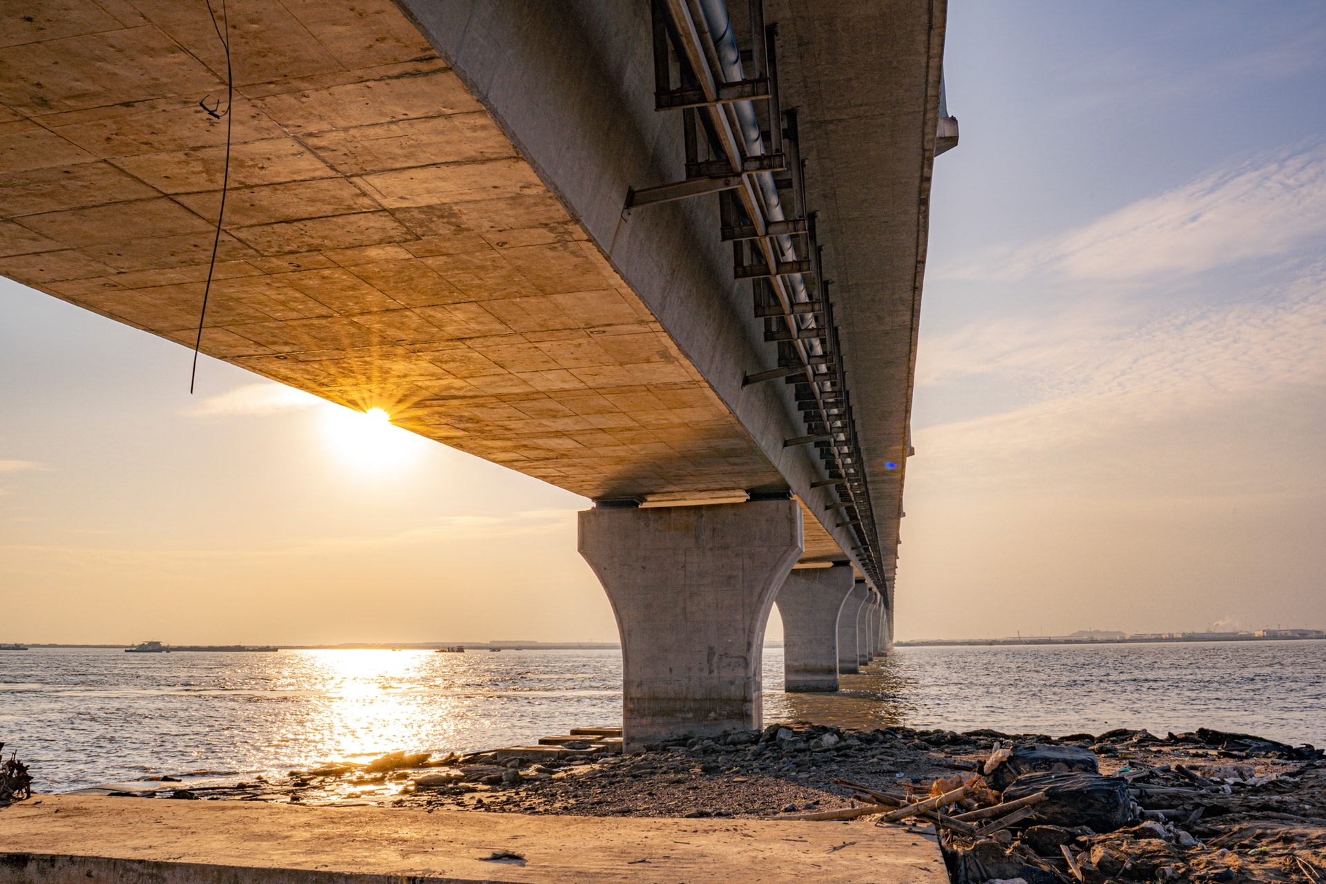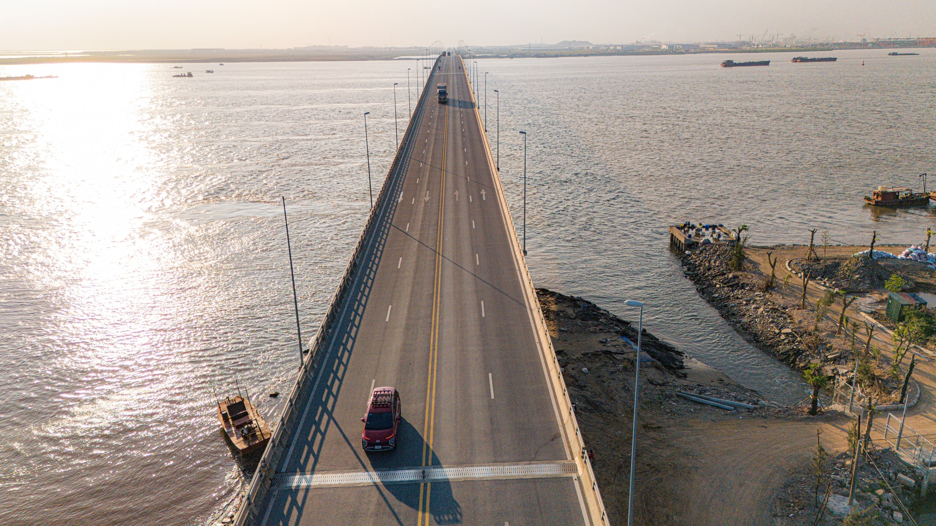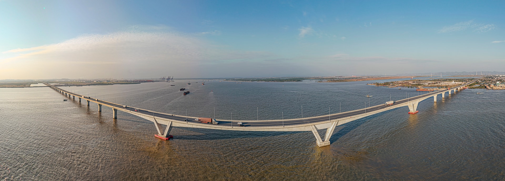 Những trụ cầu khổng lồ được thiết kế chịu tải trọng lớn và chống ăn mòn trong môi trường nước mặn, đảm bảo khả năng vận hành ổn định trước gió bão và sóng lớn - thách thức đặc thù của các công trình giao thông trên biển.