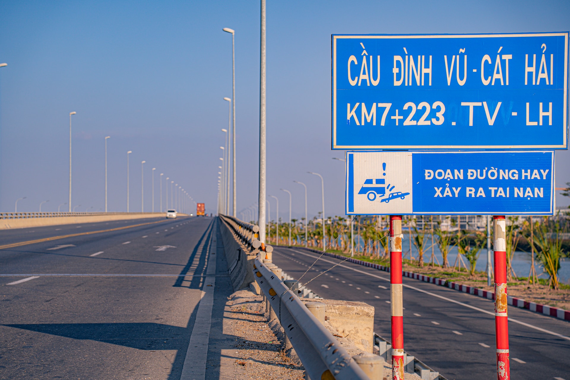 Công trình được khởi công năm 2014 và hoàn thành năm 2017, với tổng mức đầu tư khoảng 11.850 tỷ đồng, sử dụng nguồn vốn ODA Nhật Bản và vốn đối ứng trong nước, đánh dấu bước tiến quan trọng về năng lực thi công cầu vượt biển của Việt Nam.