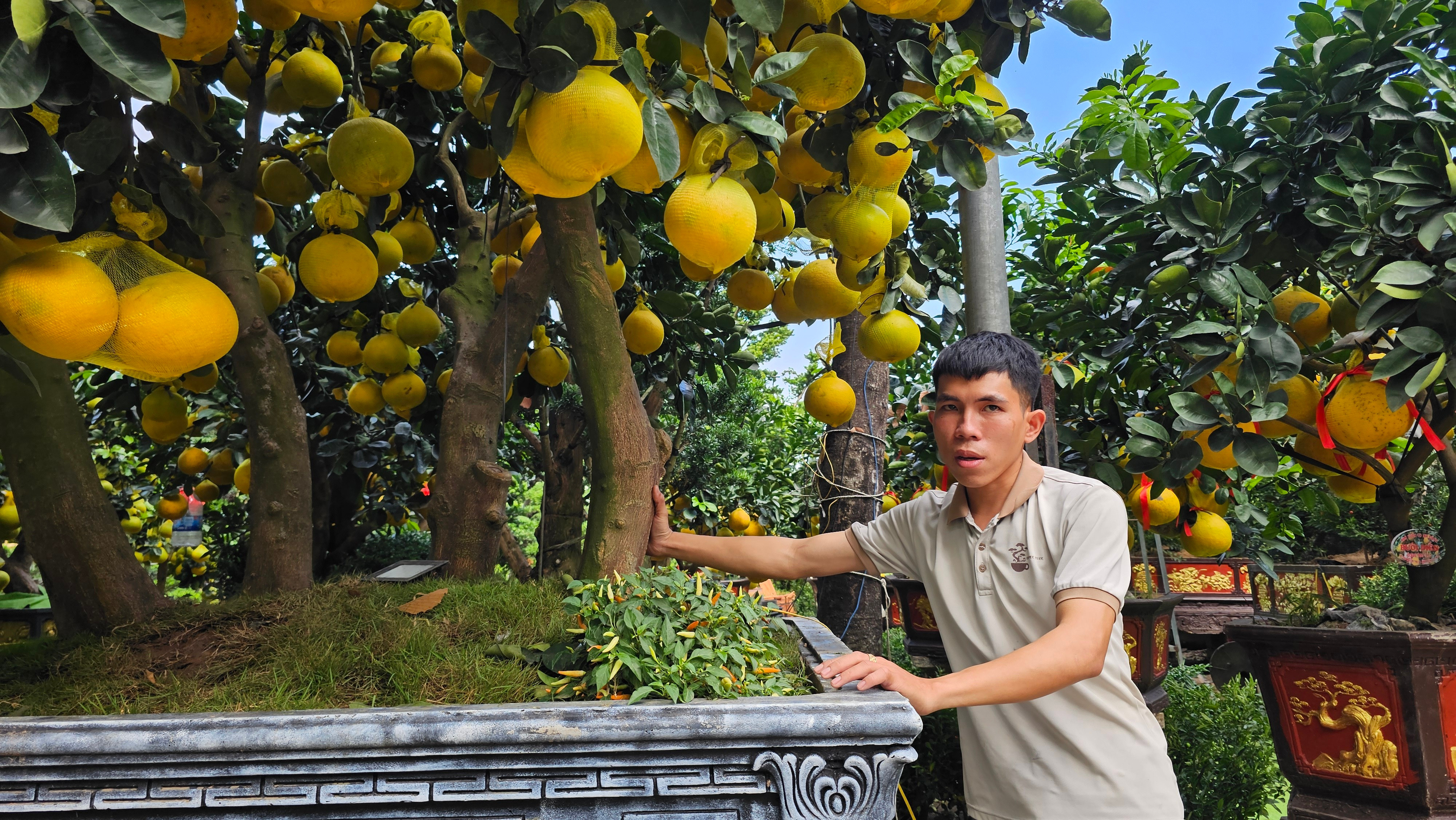 Chậu bưởi Diễn này có khoảng 400 trái bưởi thực, tức trái được nuôi tự nhiên chứ không phải trái ghép trang trí. Số lượng trái dày đặc phủ kín toàn bộ tán cây, tạo nên vẻ sung túc - yếu tố rất được ưa chuộng trong chơi cây ngày Tết. Theo anh Hà, để cây giữ được lượng trái lớn như vậy đòi hỏi quá trình chăm sóc nhiều năm liền, từ việc chọn giống, dưỡng rễ đến canh thời điểm cho ra hoa, kết trái chuẩn xác.