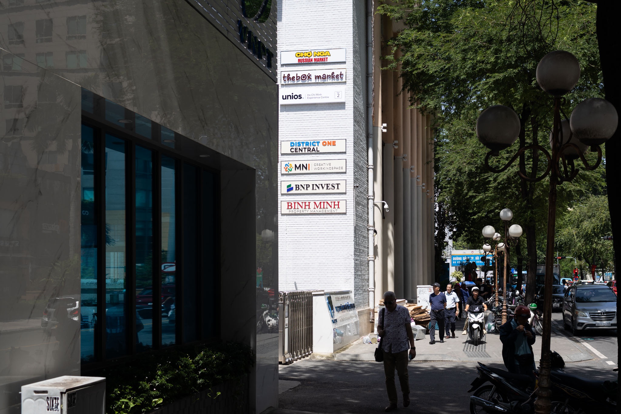 Khu vực "Chợ Nga", The Box Market nhìn từ lối vào cổng 125 Hai Bà Trưng. Nơi đây nằm trong trụ sở của Tổng công ty Bưu chính viễn thông - VNPT tại TP.HCM.