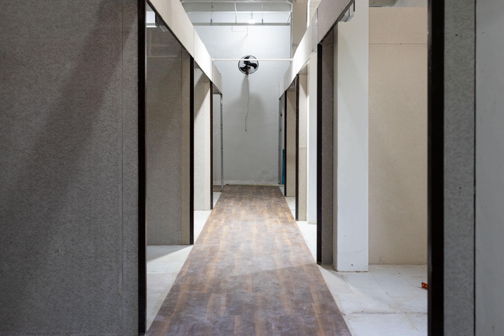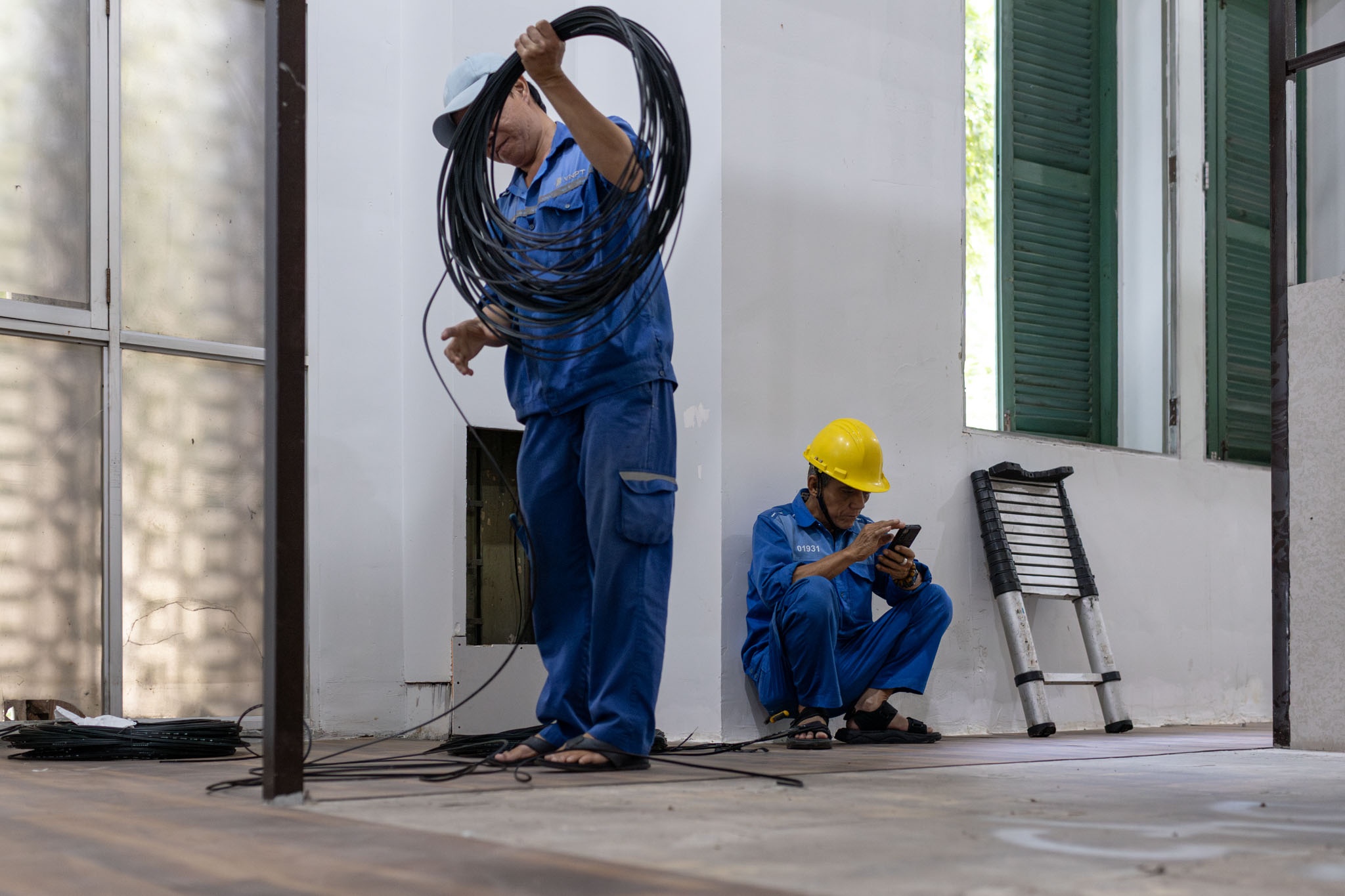 Trong hình, công nhân đang lắp đặt đường truyền Internet trên tầng hai. Ngoài ra, ghi nhận ngày 6/10, các công nhân thực hiện thi công, lắp đặt hệ thống PCCC tại tầng hầm.