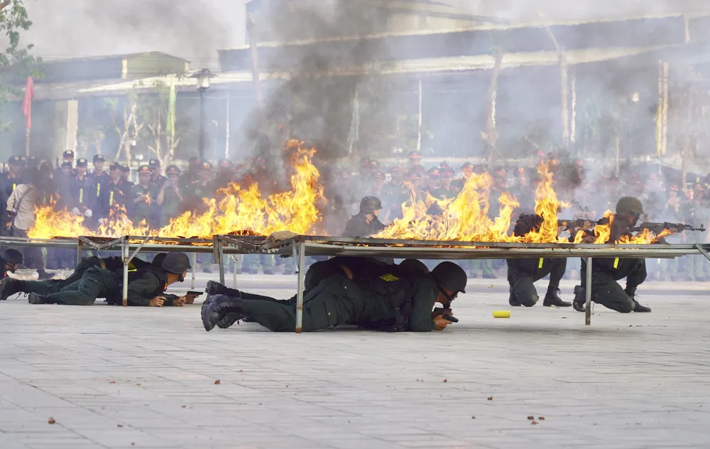 Các chiến sĩ vượt qua vật cản lửa để áp sát, bao vây mục tiêu tội phạm.
