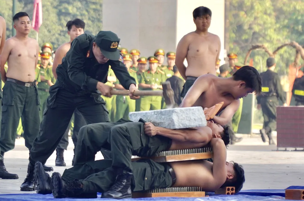 Hai chiến sĩ cởi trần, nằm trên chông đinh sắt nhọn, bên trên đặt một tảng đá lớn và đồng đội dùng búa tạ giáng xuống để công phá tảng đá.