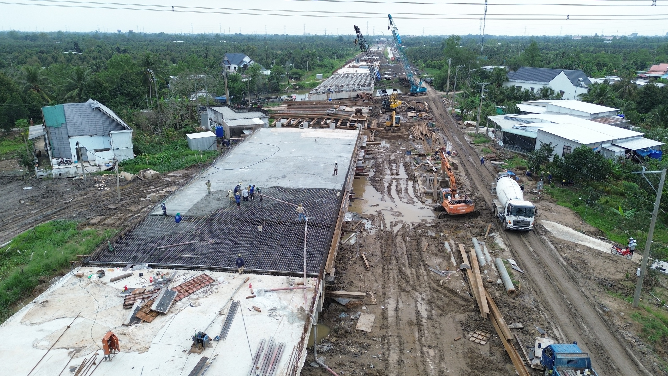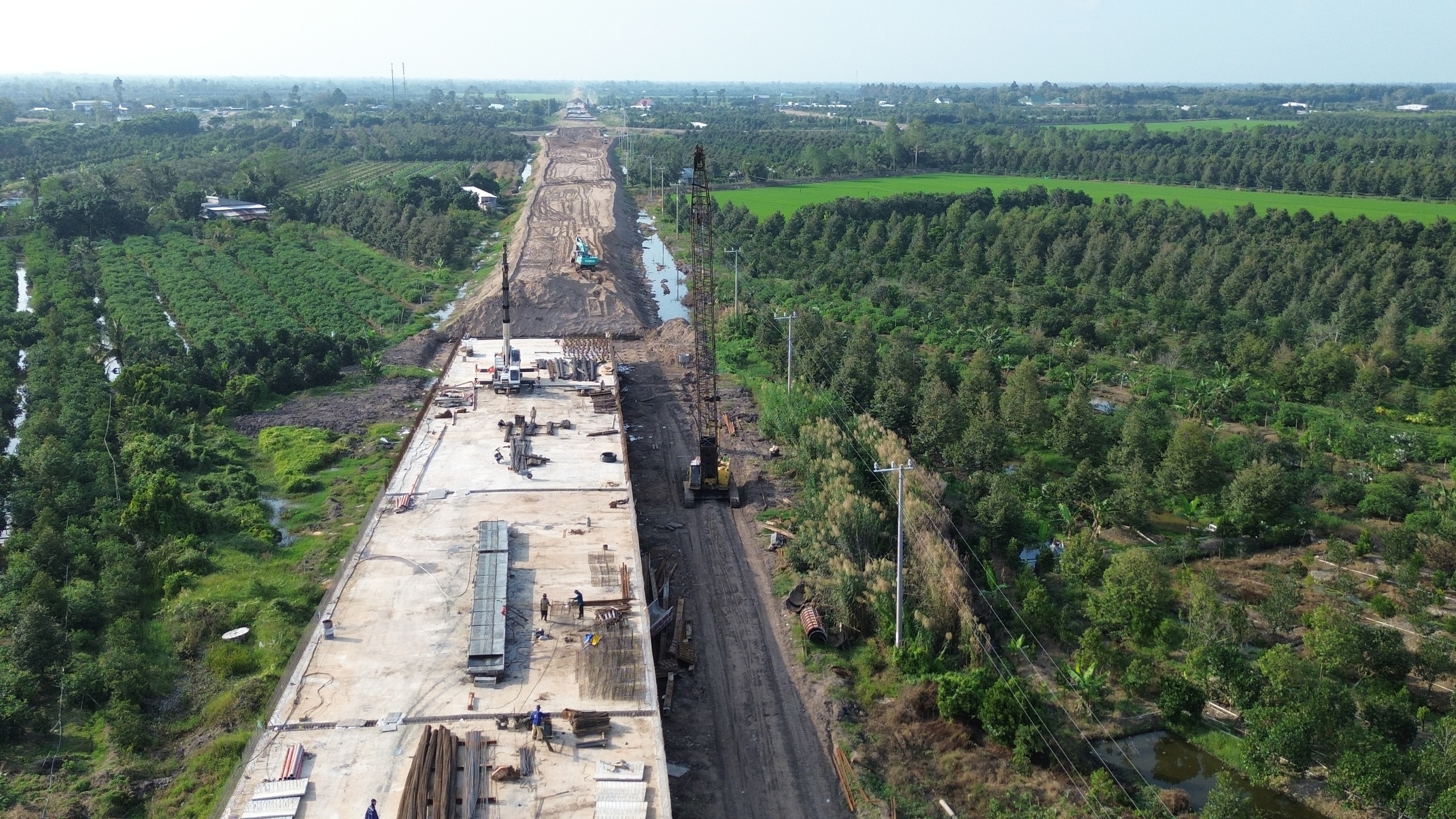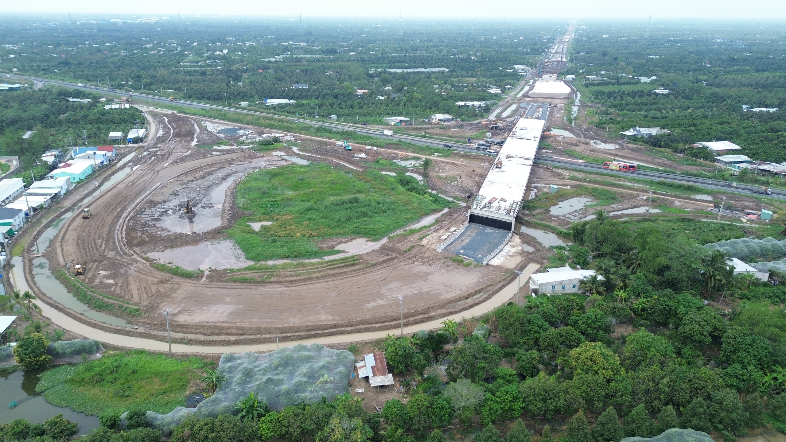 Dự án thành phần 2 dài 11,43km (đoạn qua tỉnh Tiền Giang cũ), có điểm đầu kết nối dự án thành phần 1 tại Km16 (xã Mỹ Hiệp), điểm cuối kết nối vào cao tốc Trung Lương - Mỹ Thuận. Trên công trường hàng trăm kỹ sư, thợ cầu ngày đêm thi công để sớm khép kín tuyến cao tốc.