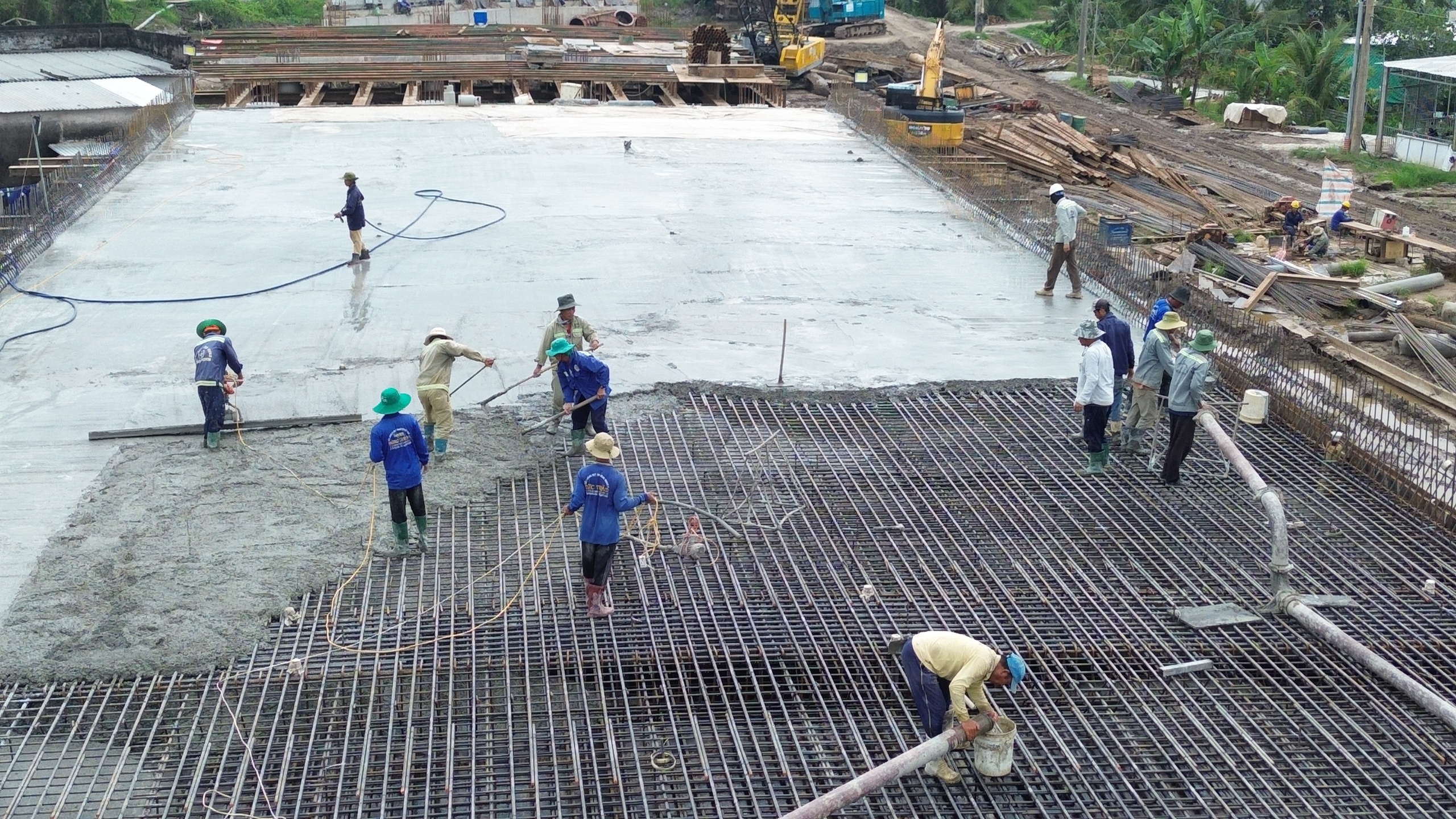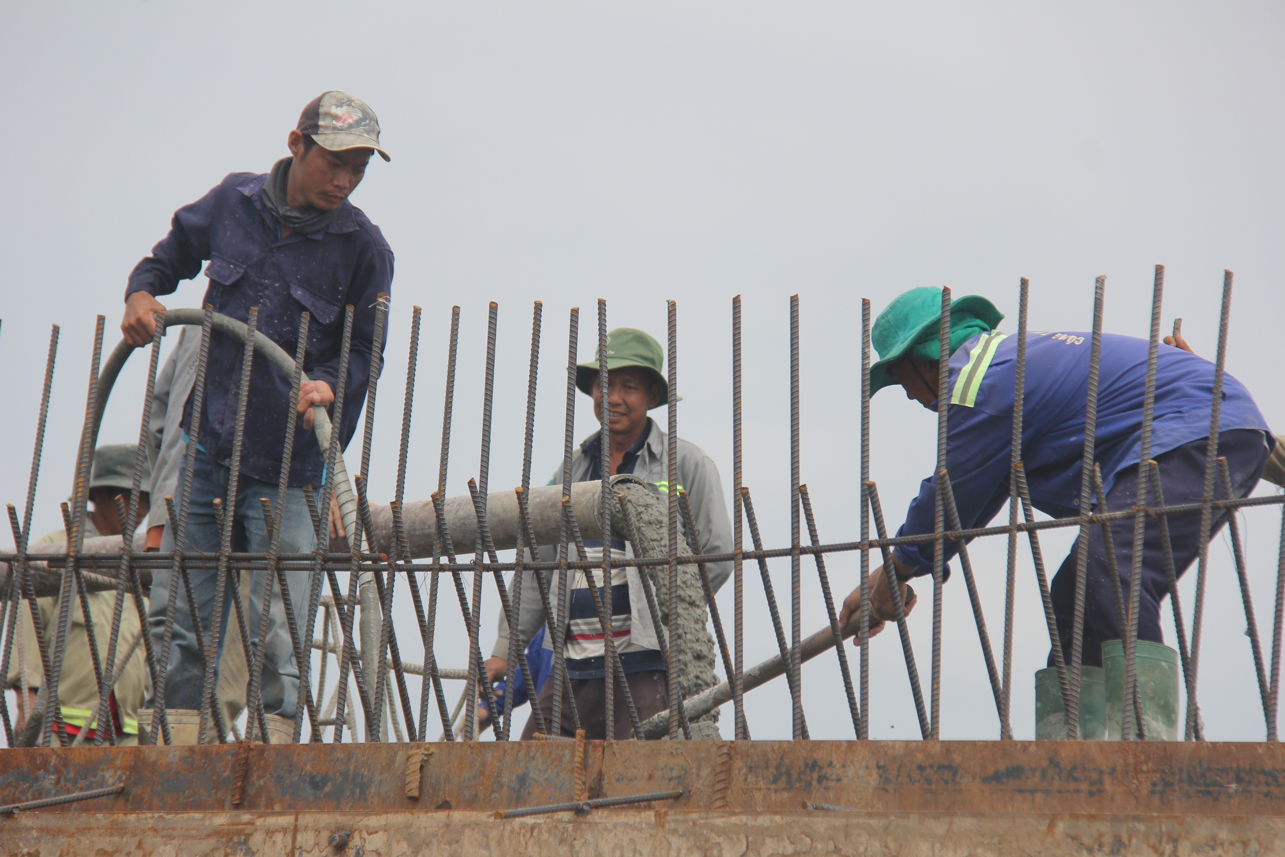 Hàng chục công nhân đổ bê tông mặt cầu Bà Hương.