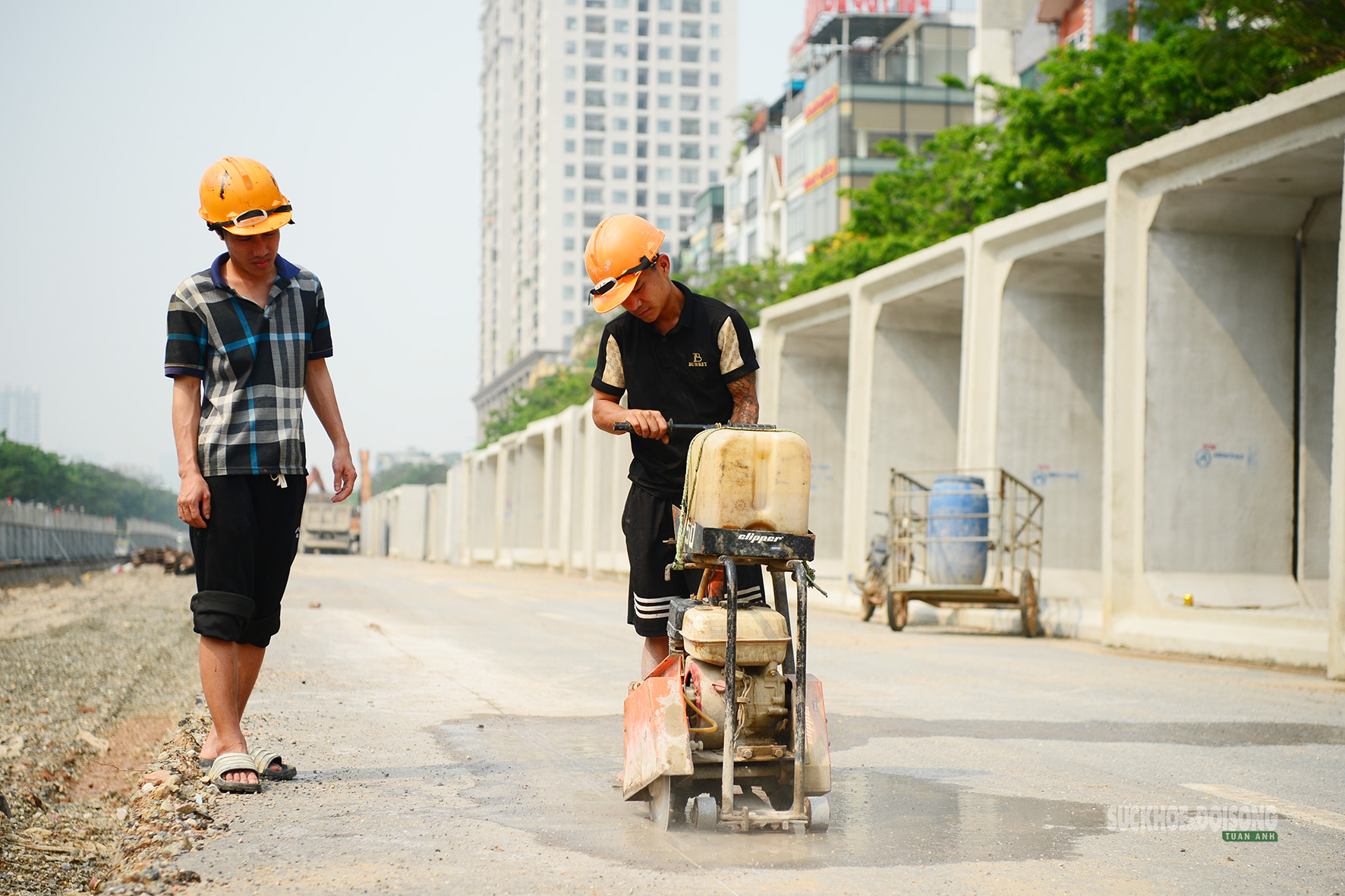 Công nhân thi công trong khu vực quây rào dọc tuyến.