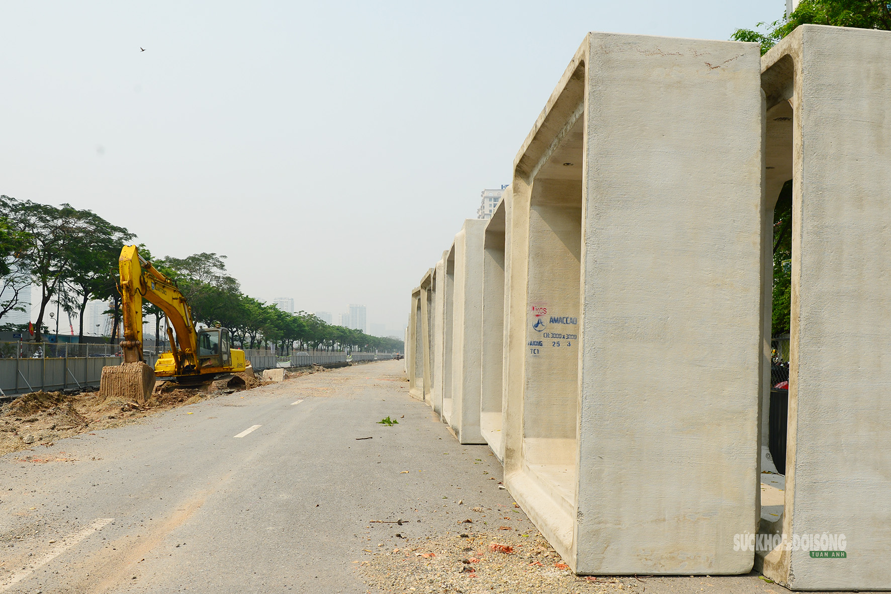 Các đốt cống hộp bê tông được tập kết dọc tuyến.