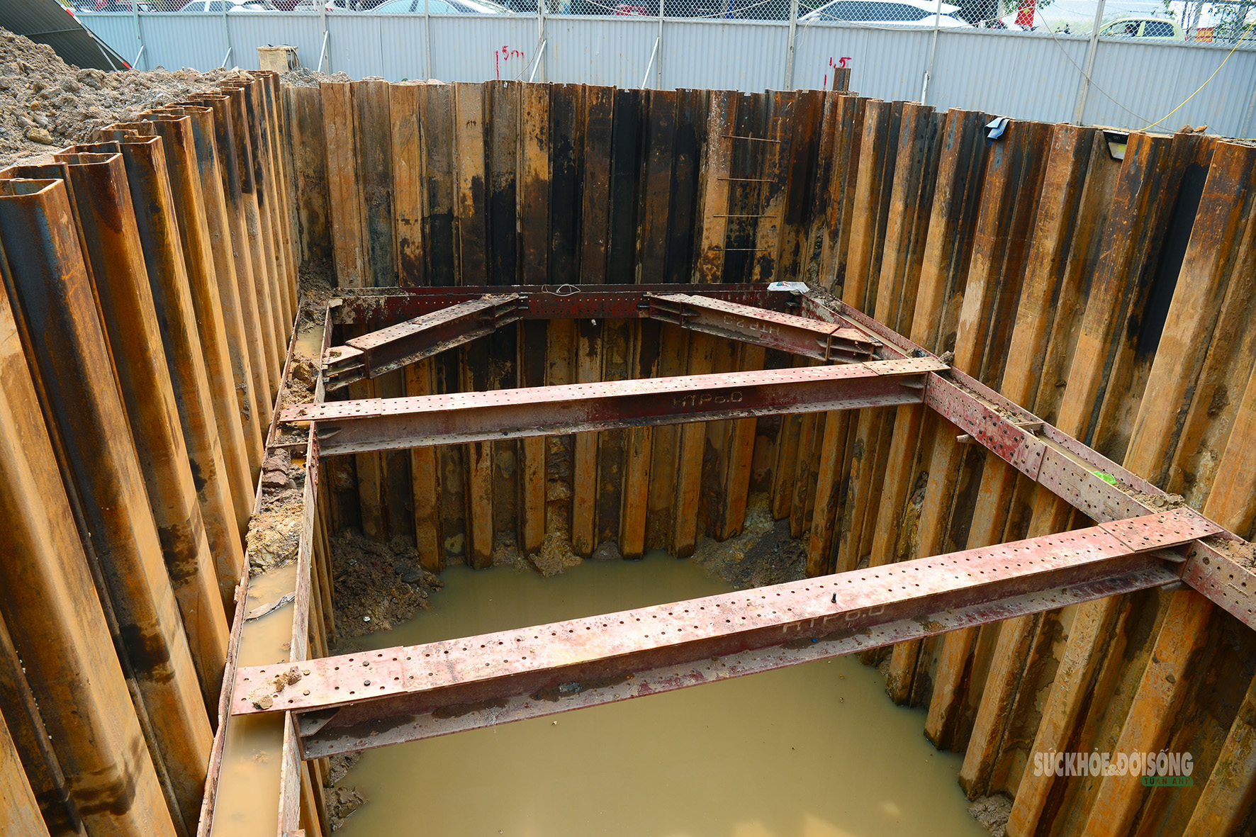 Hố đào sâu được vây cừ thép tại công trường.