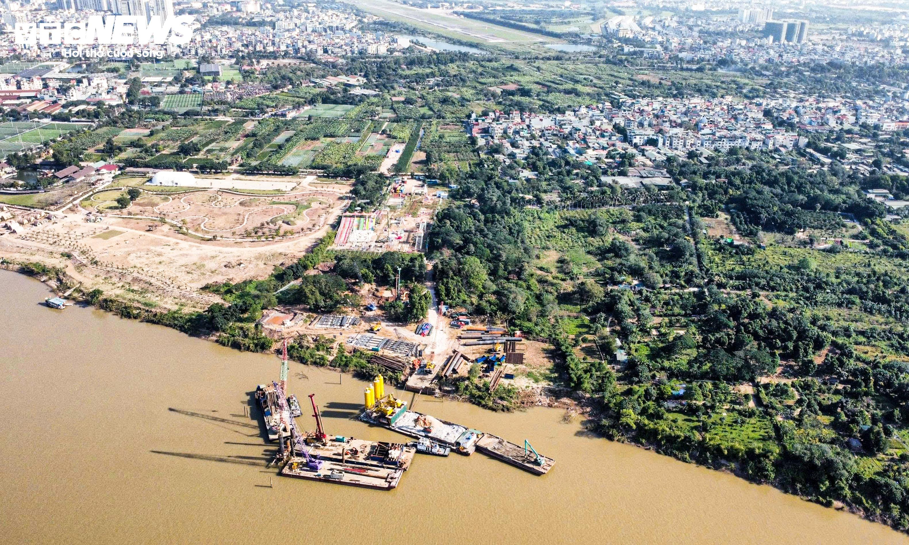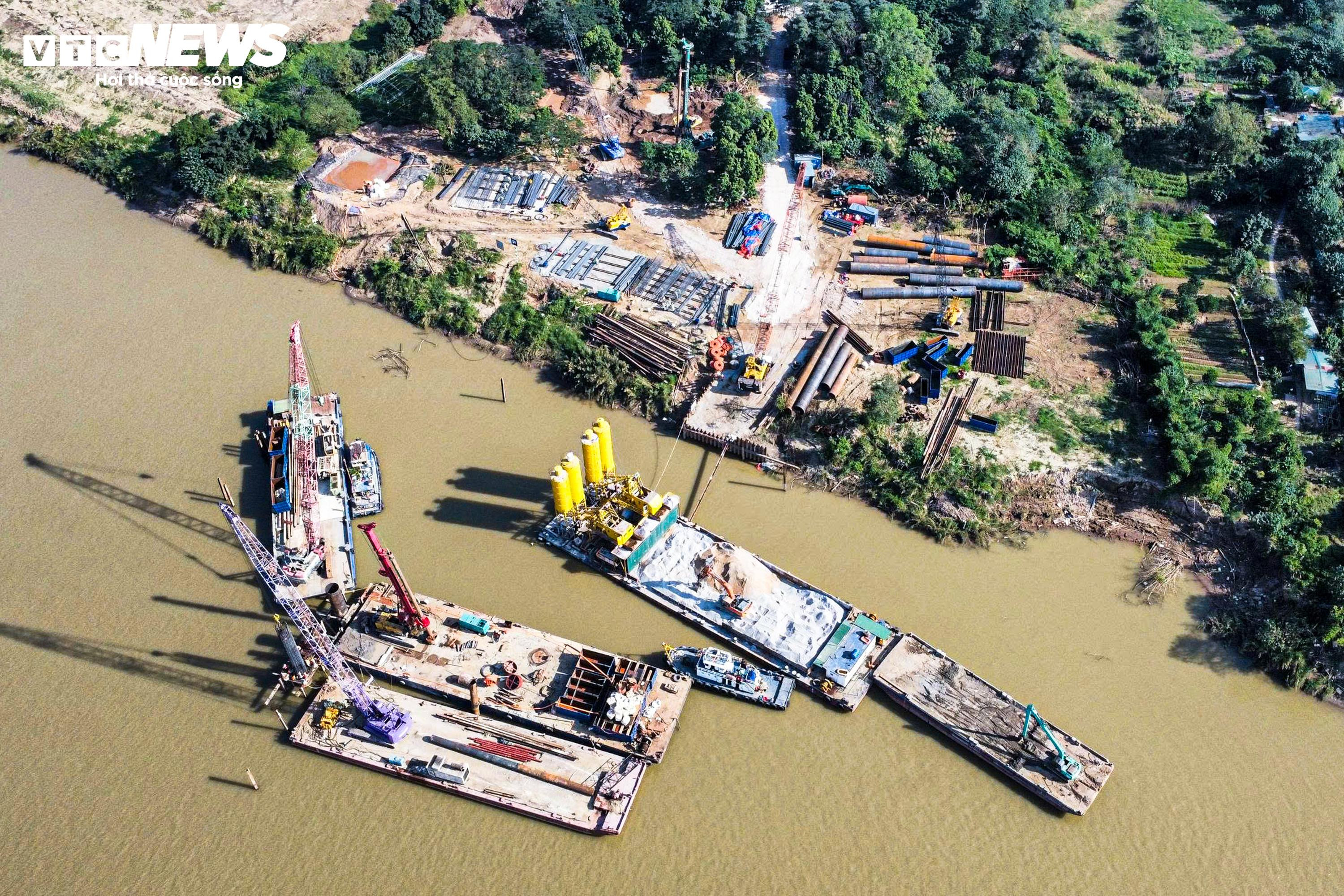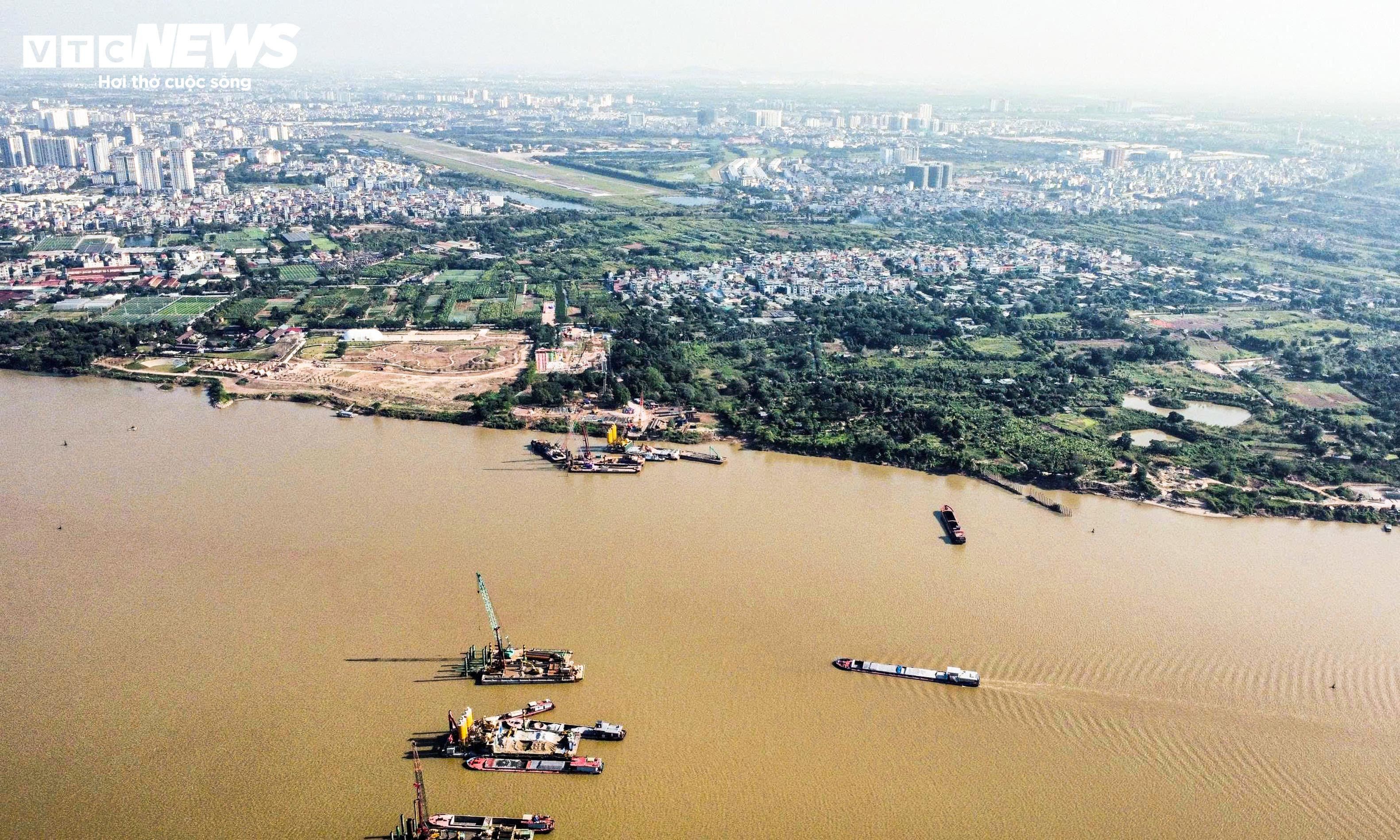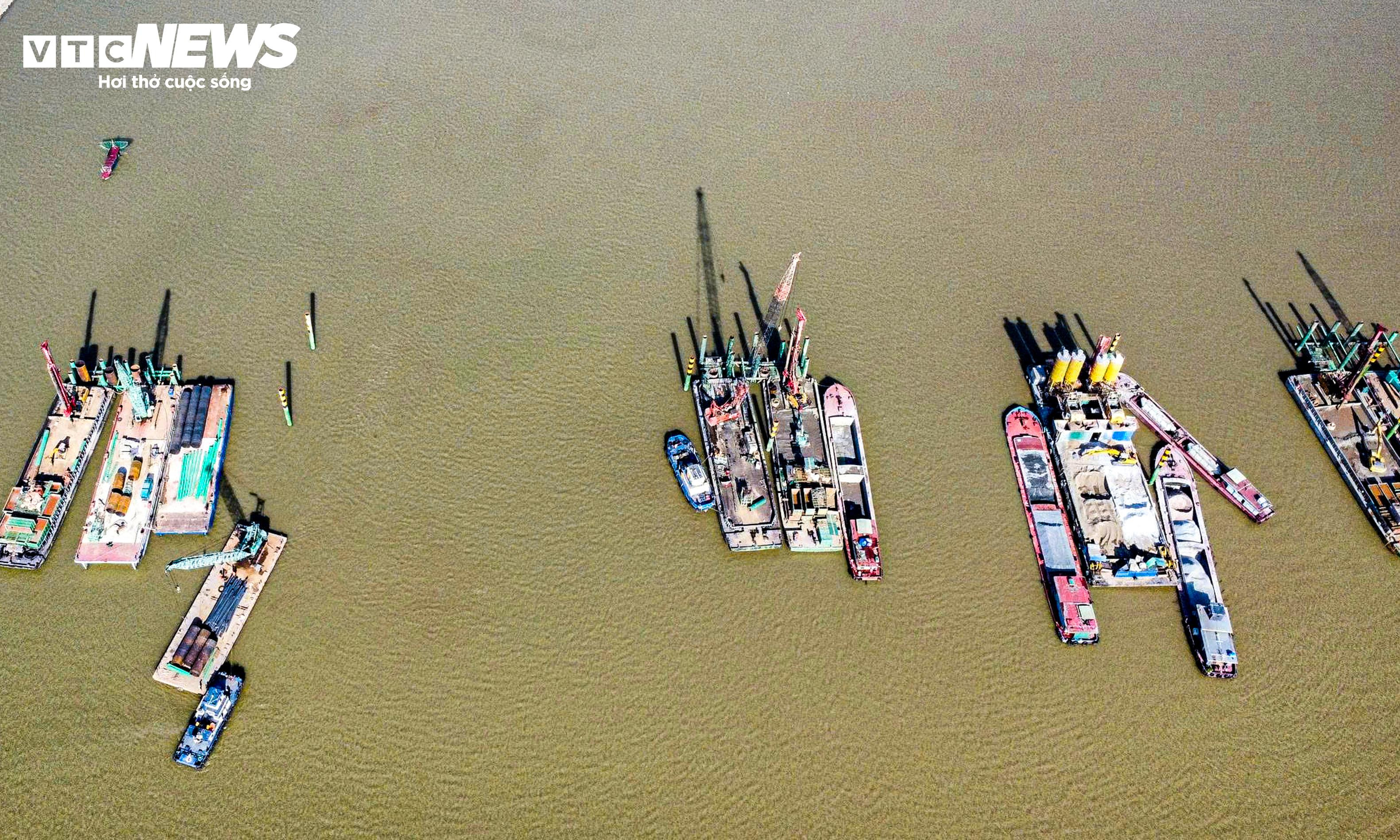 Trên mặt sông Hồng, nhiều sà lan, tàu chuyên dụng và thiết bị thi công cỡ lớn được huy động để triển khai các hạng mục móng trụ, kết cấu dưới nước.