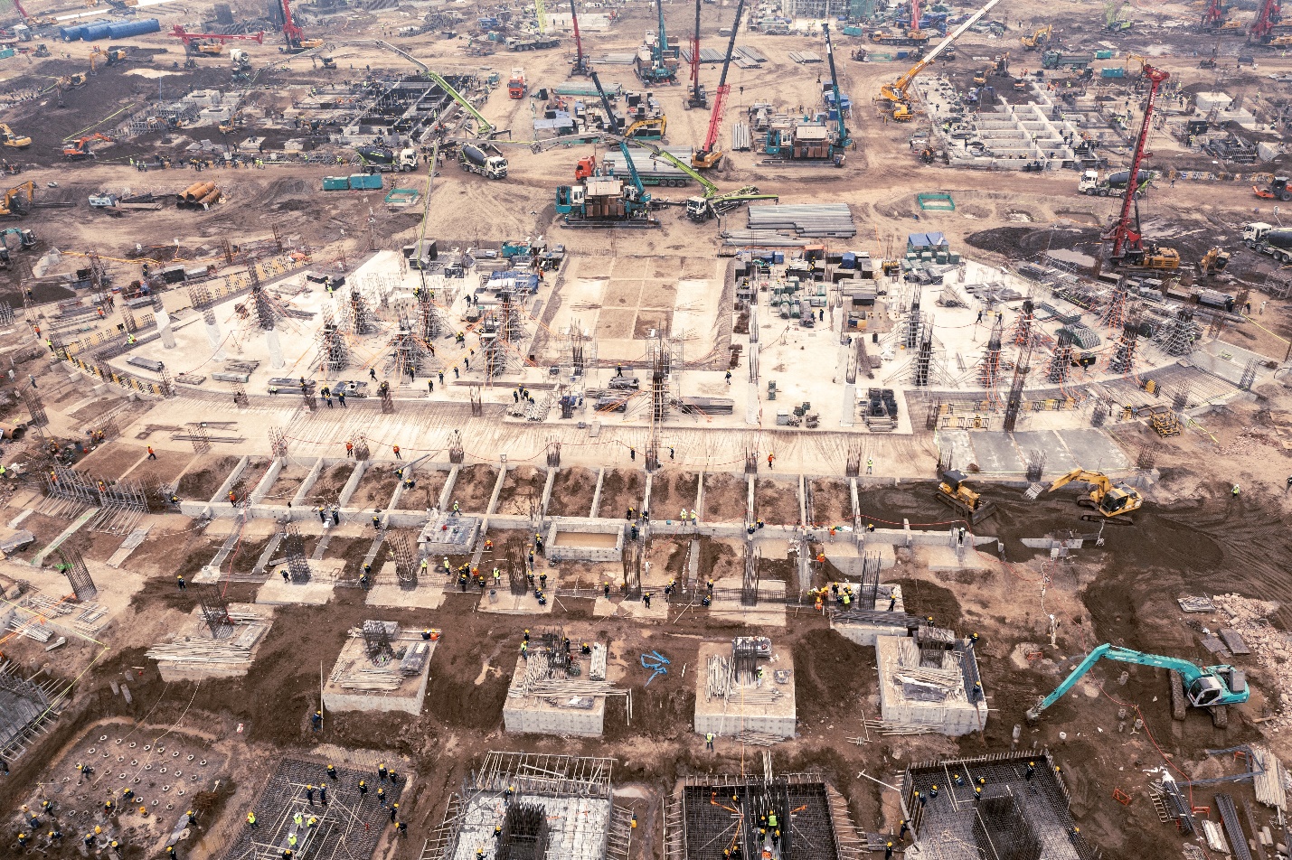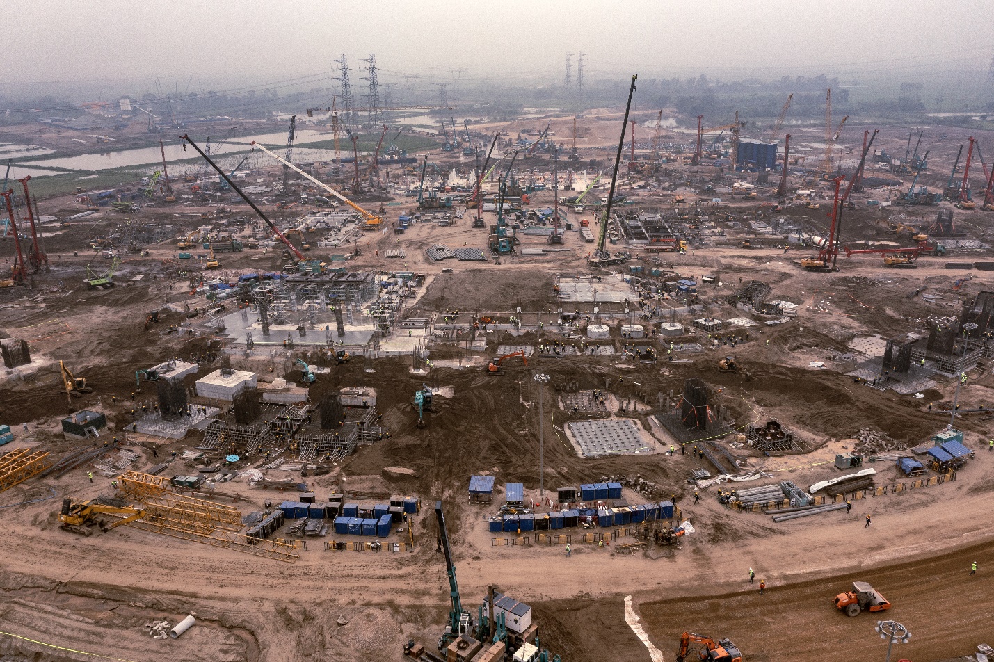 Hàng loạt thiết bị cơ giới như máy xúc, máy ủi cùng hàng nghìn công nhân đang hoạt động liên tục để phục vụ thi công dự án.
