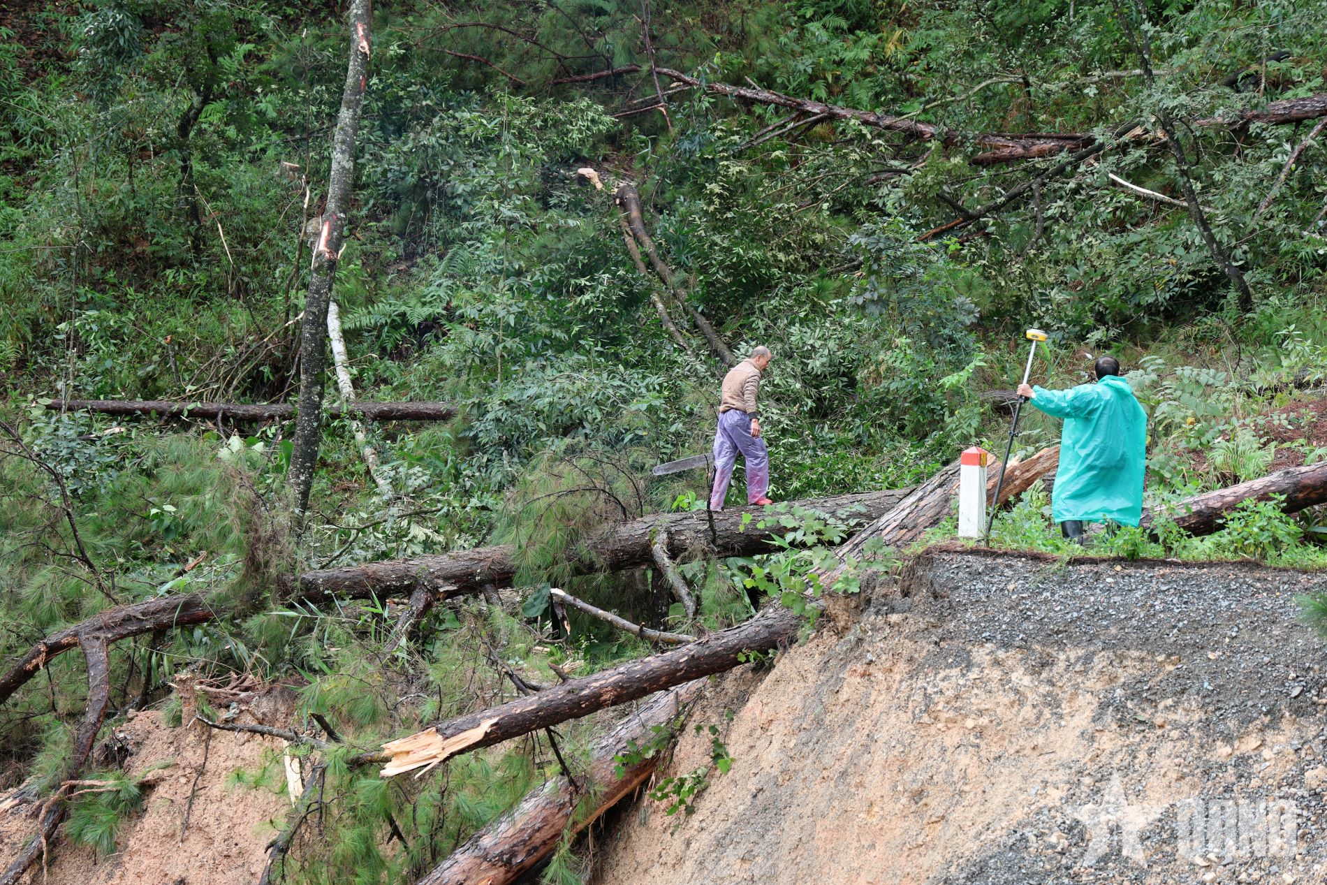 Công nhân đang cưa cây cho các phương tiện mở đường vào phía taluy dương của đèo.