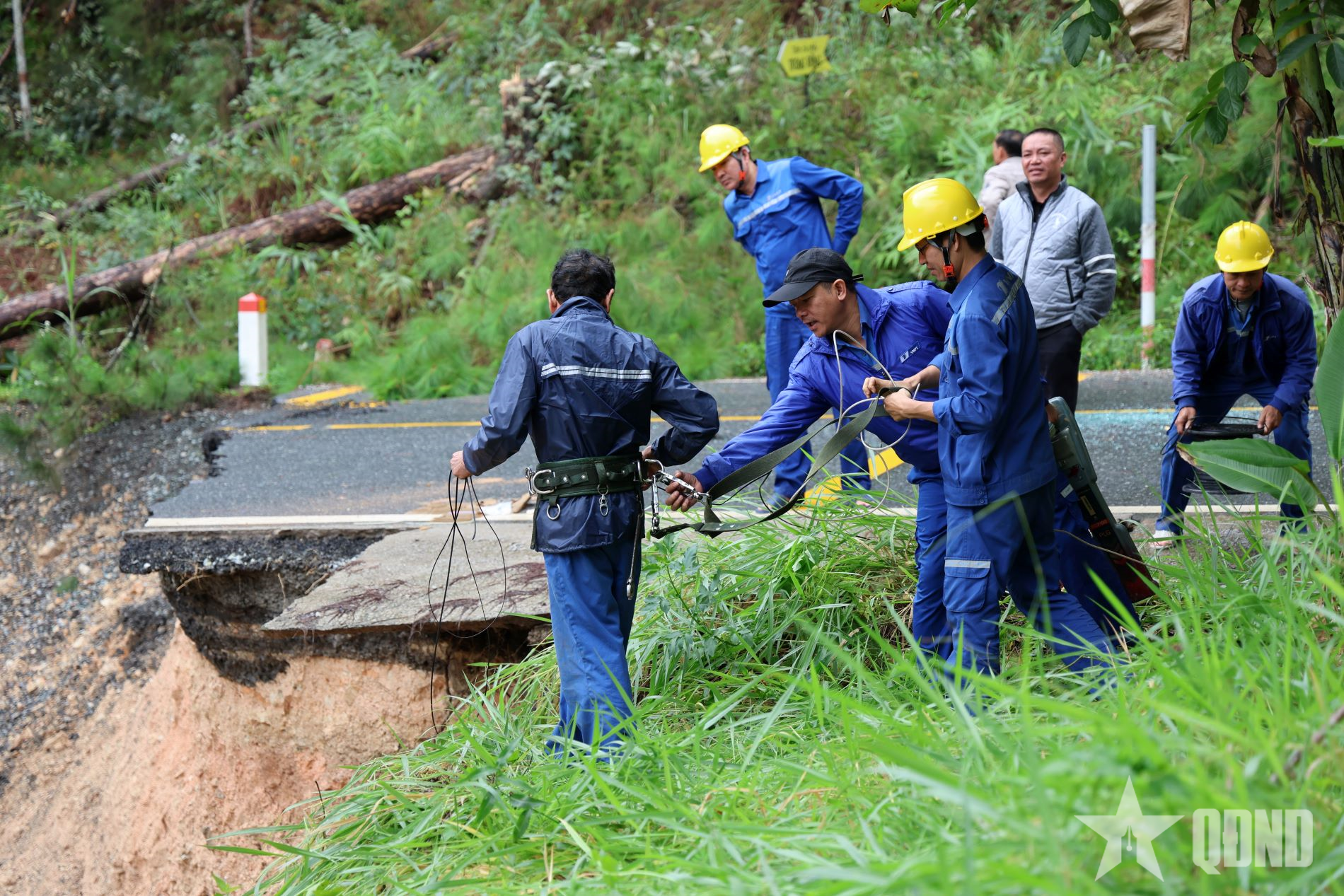 Công nhân khắc phục sự cố hệ thống viễn thông tại khu vực sạt lở.