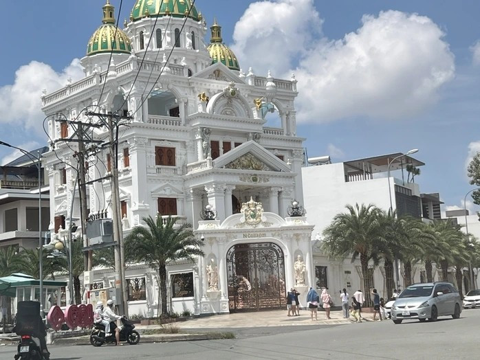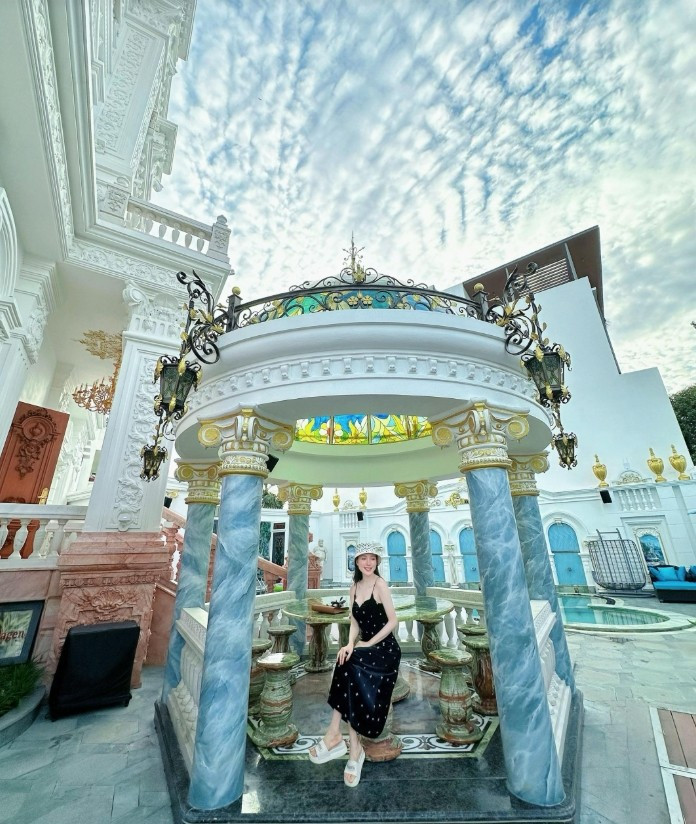 Dinh thự của Ngân Collagen có màu trắng, chạm trổ hoa văn cầu kỳ theo lối kiến trúc cổ điển. Ảnh: FBNV
