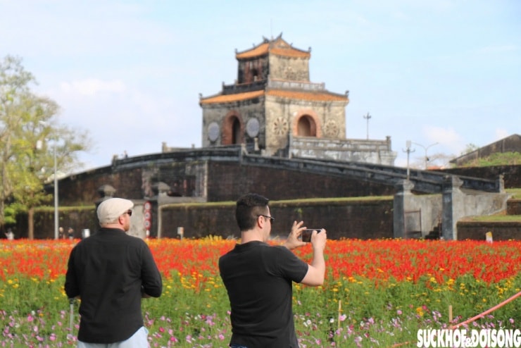 Nhiều du khách quốc tế thích thú ghi lại hình ảnh sắc xuân ngập tràn bên Kinh thành Huế.