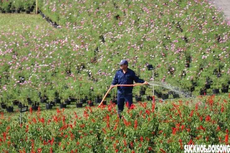 Các công nhân miệt mài sắp xếp và chăm sóc từng chậu hoa để tạo nên tác phẩm nghệ thuật quy mô lớn.