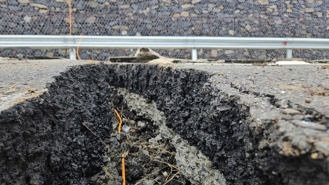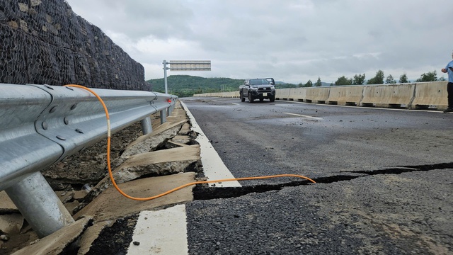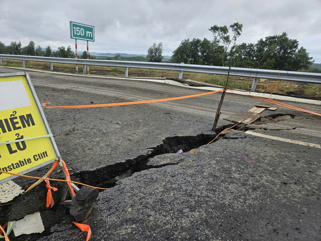 Theo ghi nhận của phóng viên, trên đoạn đường khoảng 500 m nhiều chỗ xuất hiện vết nứt lớn, kéo dài, cắt ngang. Có vị trí mặt đường bị xé toạc, sụp lún, lớp bê-tông nhựa bong tróc, bùn đất tràn lên mặt đường.