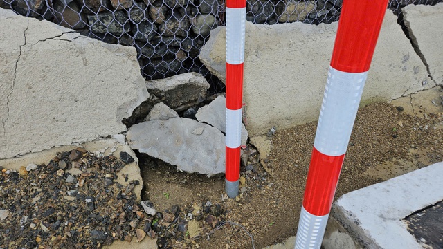 Bên cạnh đó, hệ thống lan can và trụ đỡ an toàn giao thông cũng bị xô lệch, cong vênh, một số trụ bật khỏi nền móng do tác động của khối đất sạt trượt từ ta-luy dương. Toàn bộ khu vực hư hỏng hiện đã được rào chắn, căng dây cảnh báo.