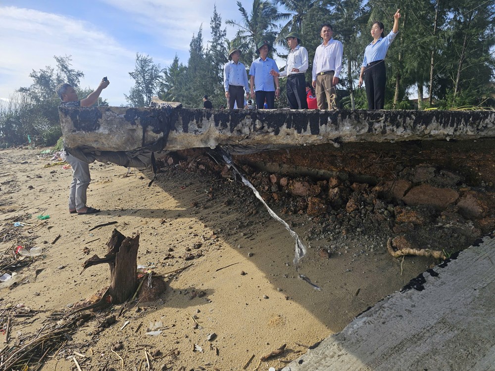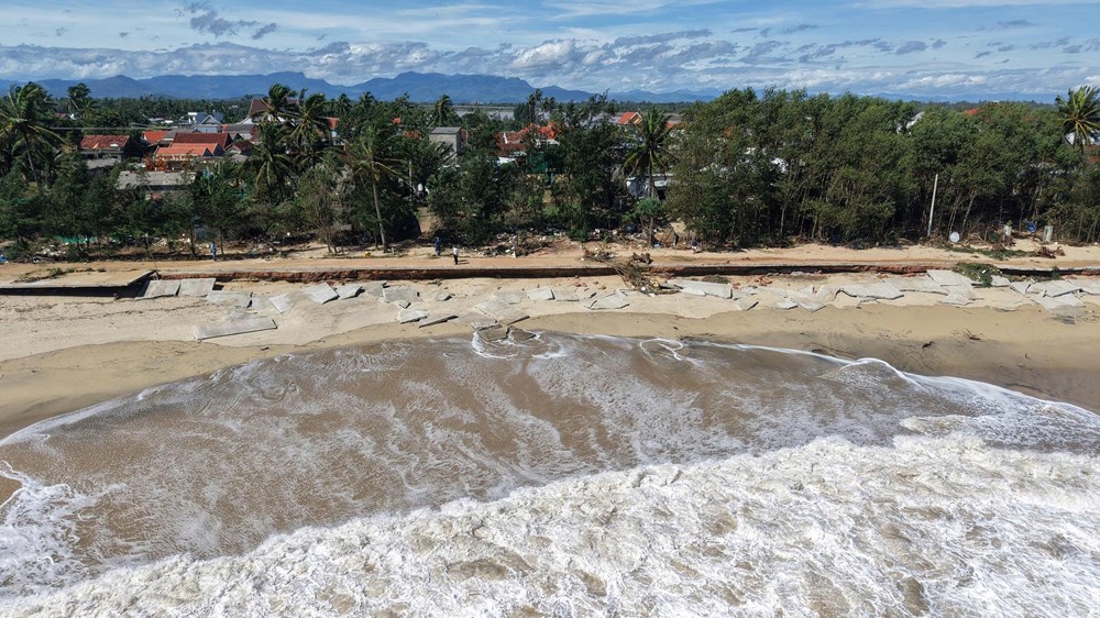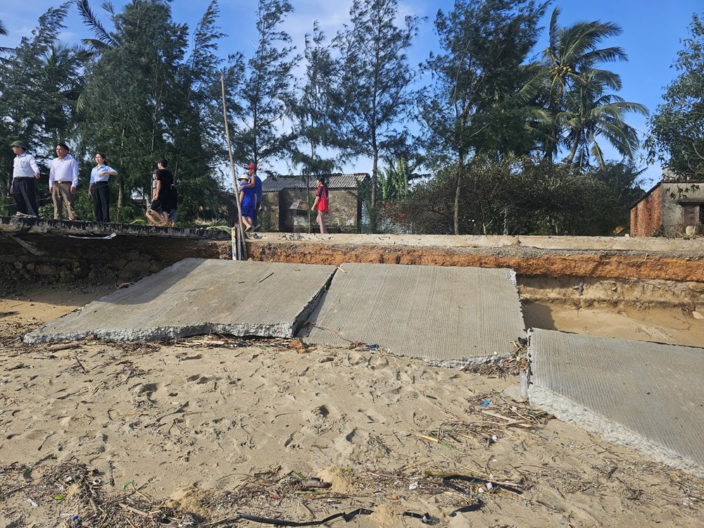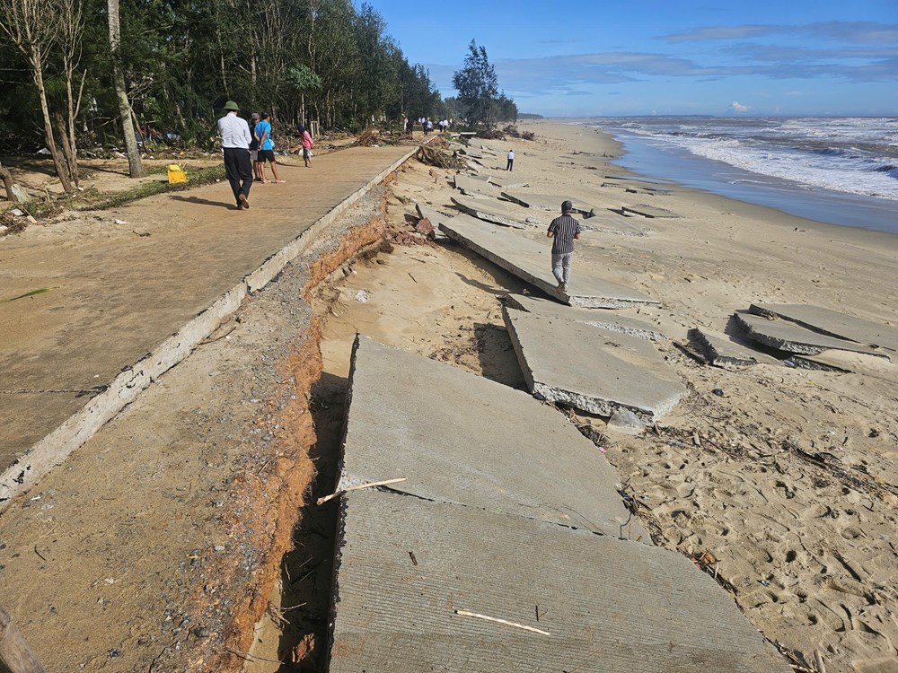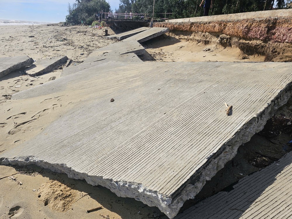 Một đoạn đường biển xã Vạn Tường bị sóng lớn đánh sập, bê tông vỡ vụn nằm ngổn ngang