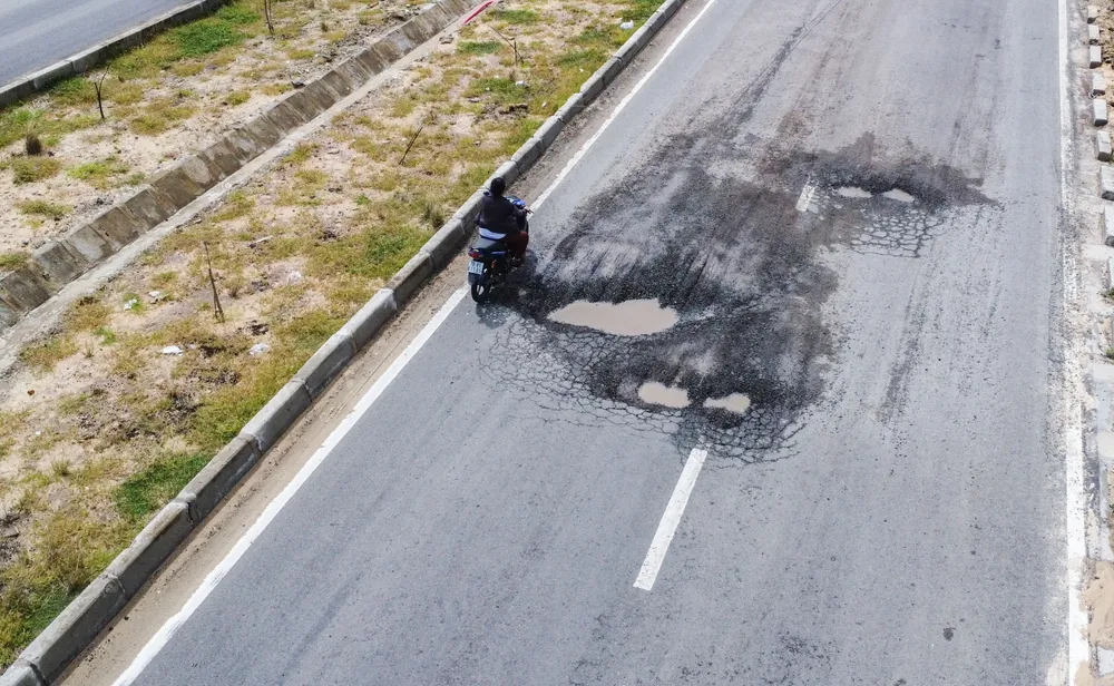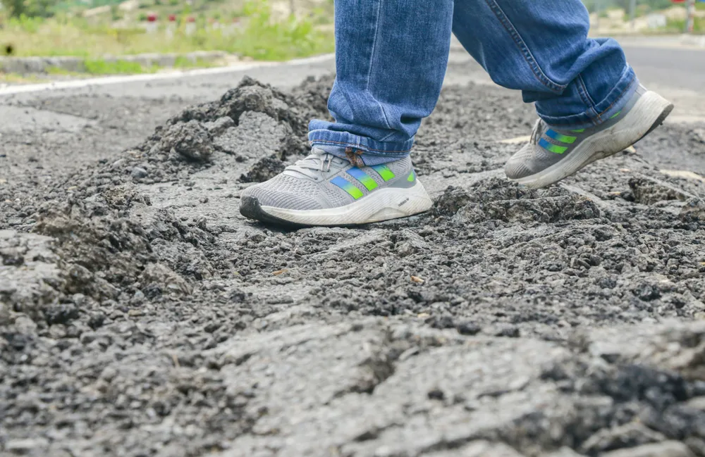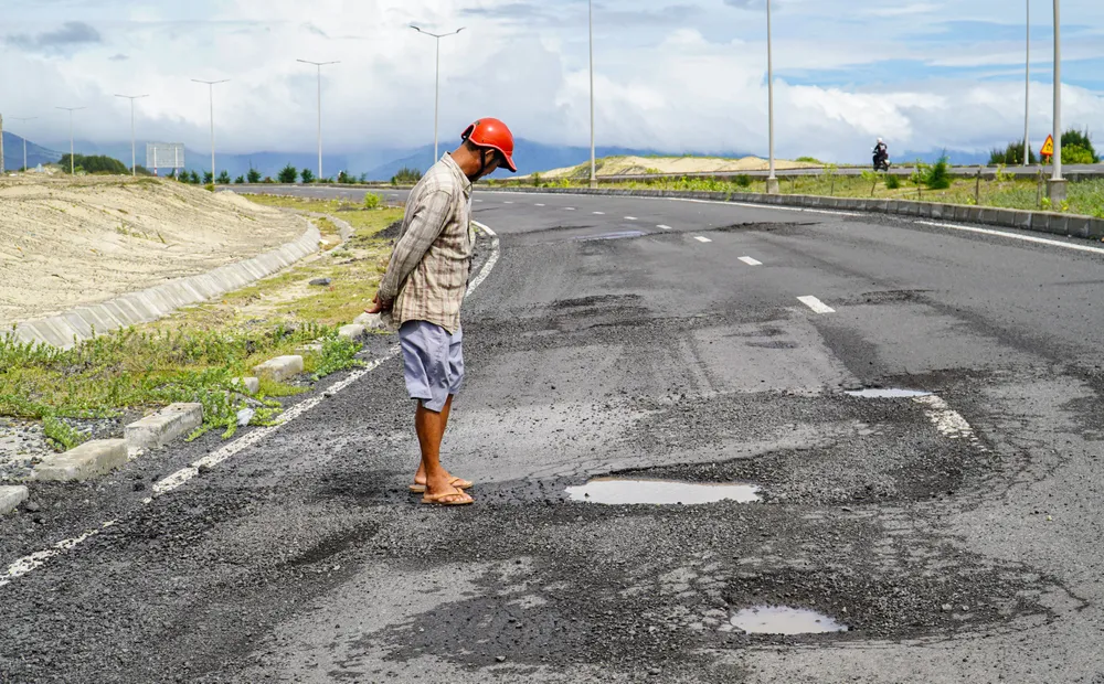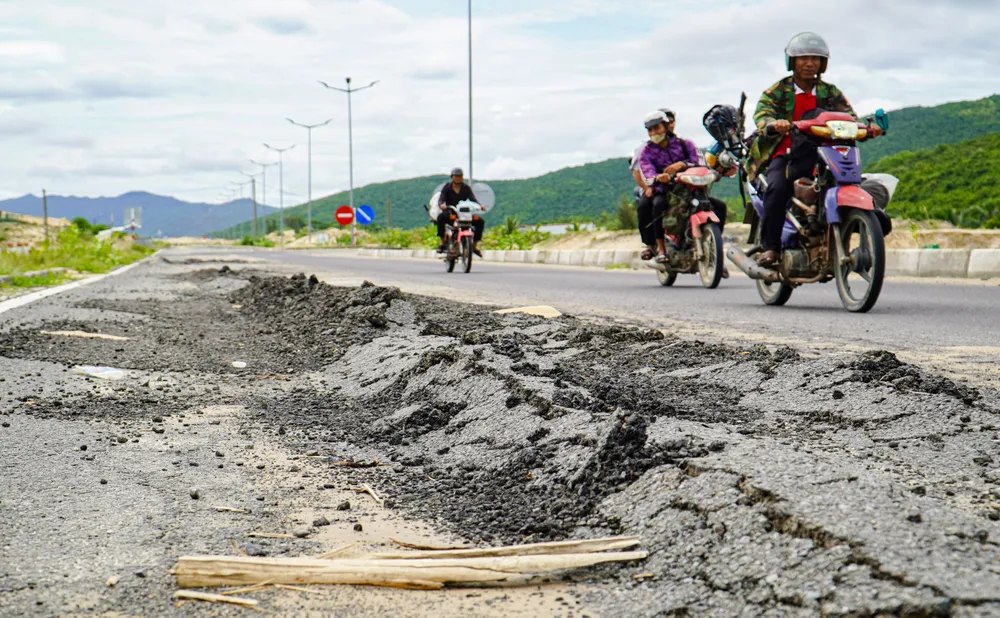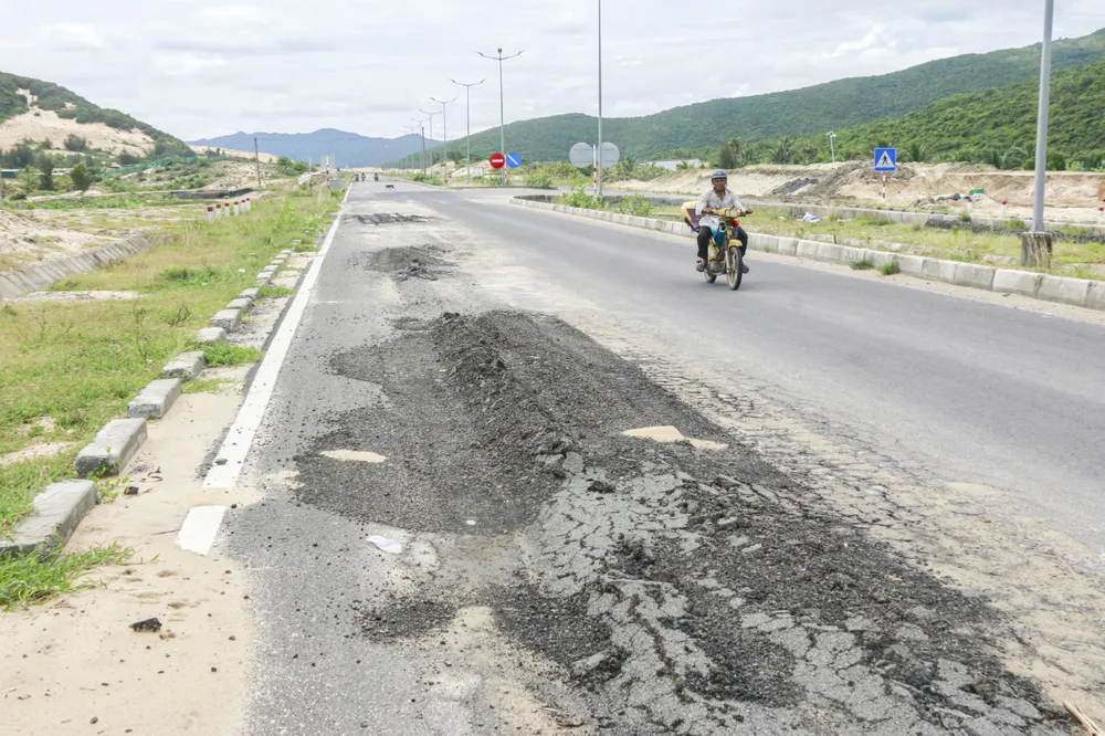Dự án đường giao thông ngoài cảng trung chuyển quốc tế Vân Phong (giai đoạn 1) qua xã Đại Lãnh, tỉnh Khánh Hòa vừa bàn giao hơn 10 tháng nhưng đã hai lần hư hỏng, nhiều người đi đường sụp "ổ gà", "ổ voi", té ngã bị thương.