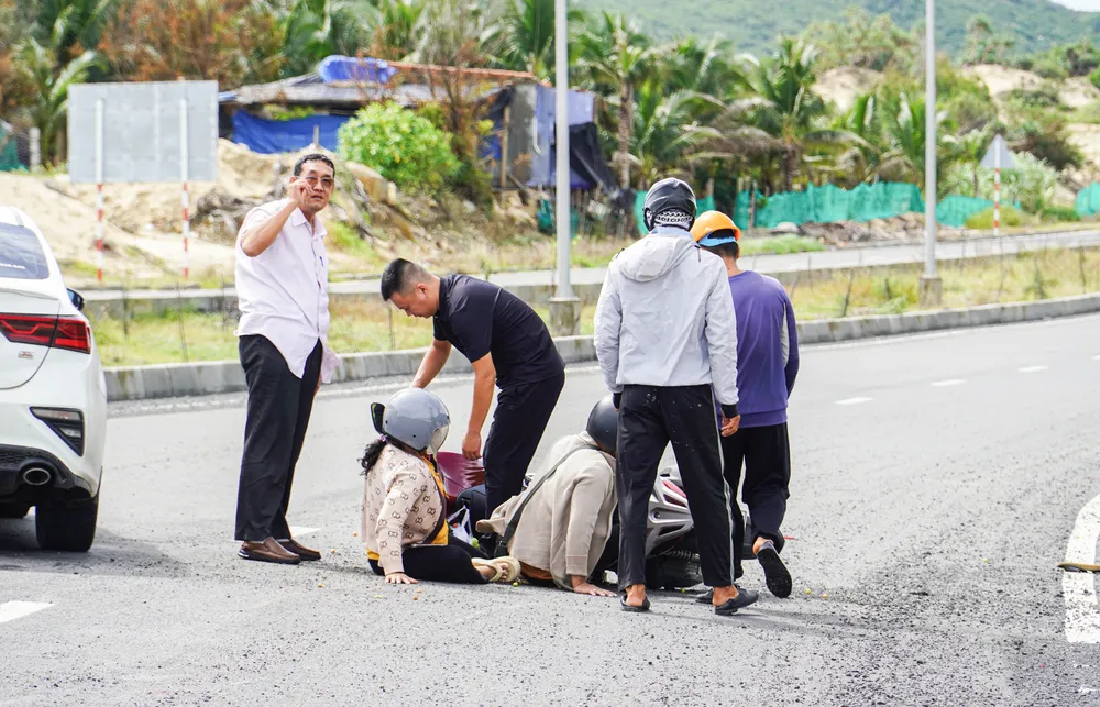 Khi PV đang ghi nhận đường xuống cấp thì chứng kiến cảnh hai vợ chồng đi xe máy sụp "ổ gà" té ngã xuống đường.