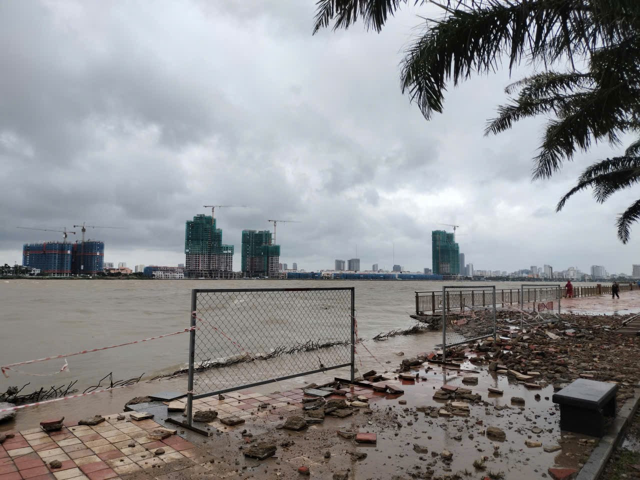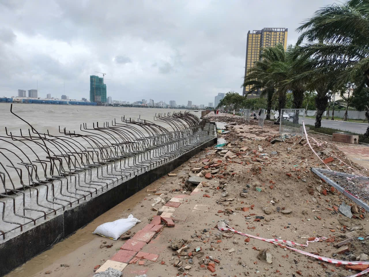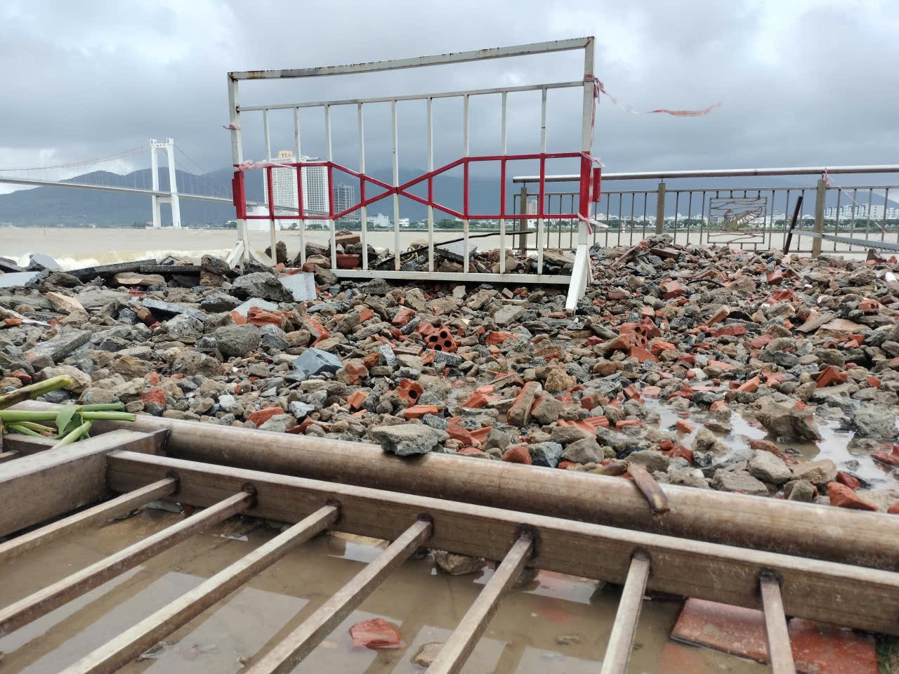 Vỉa hè, lan can đường Như Nguyệt dọc bờ sông Hàn bị sóng đánh nát.