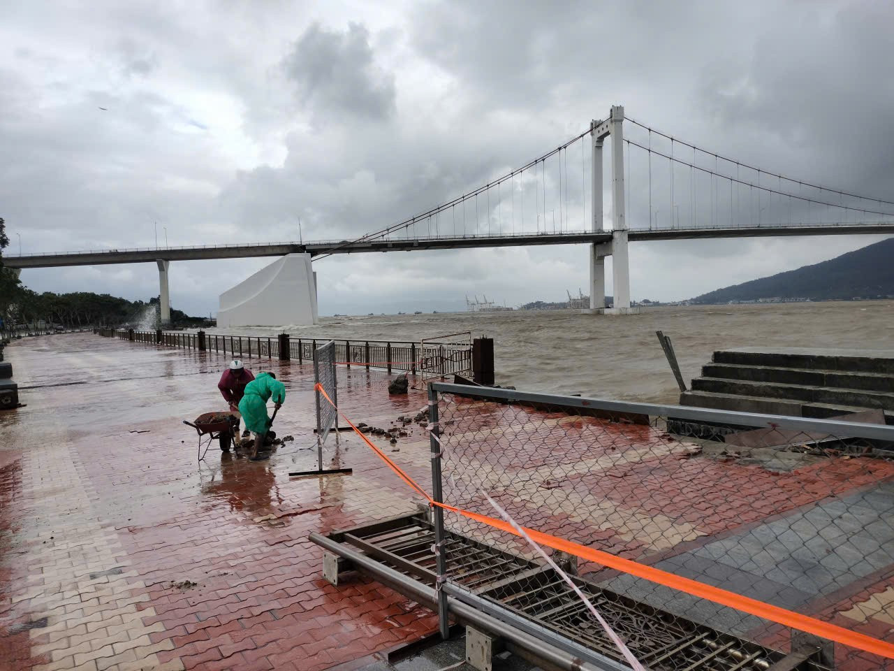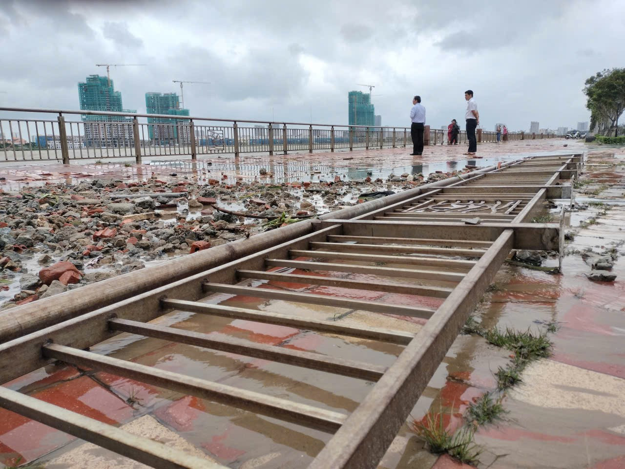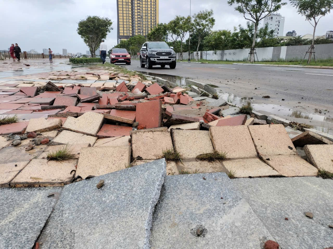 Vỉa hè, lan can đường Như Nguyệt dọc bờ sông Hàn bị sóng đánh nát.