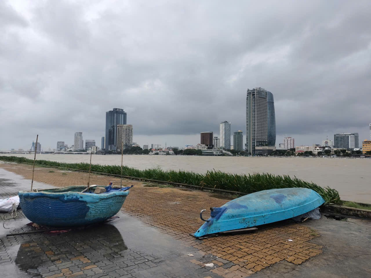 Nước sông Hàn đang lên nhanh, tàu thuyền trên sông đã được di dời để đảm bảo an toàn.