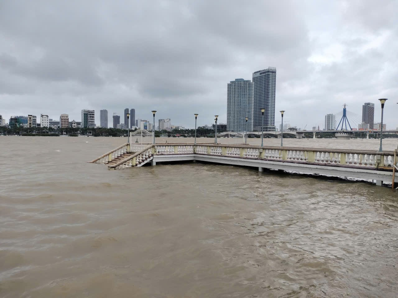 Nước sông Hàn dâng cao nhìn từ bờ Đông, dọc đường Trần Hưng Đạo.