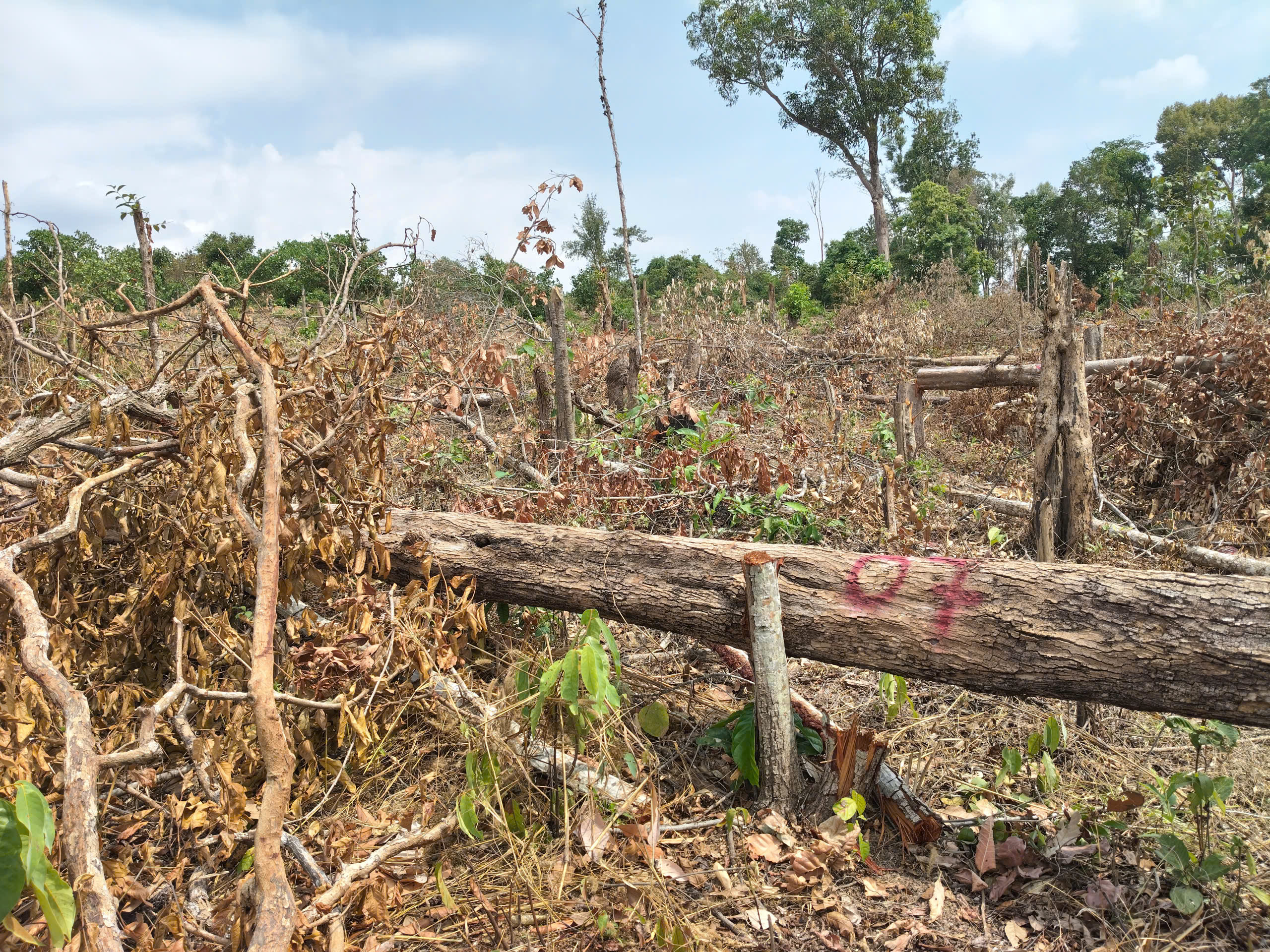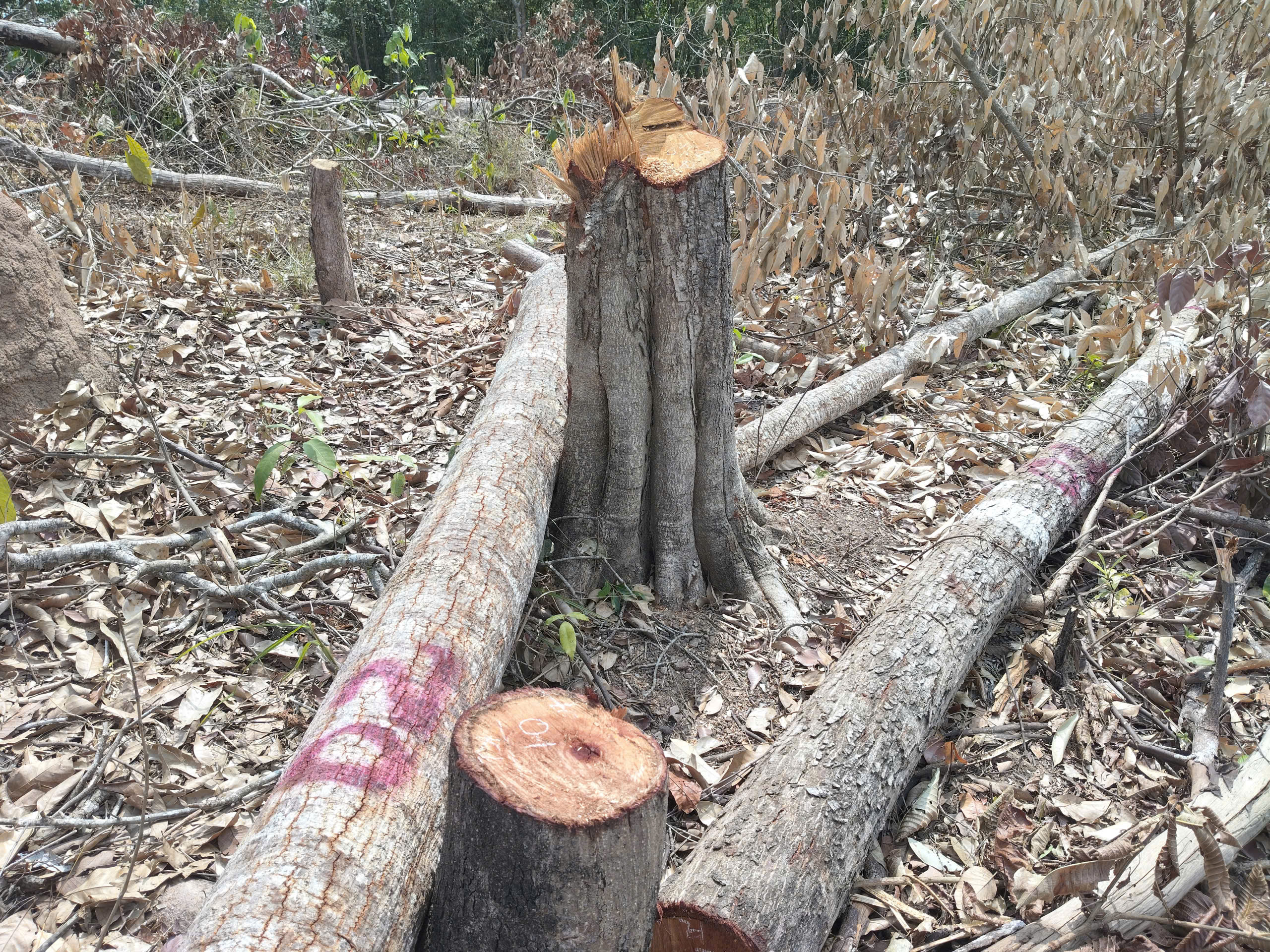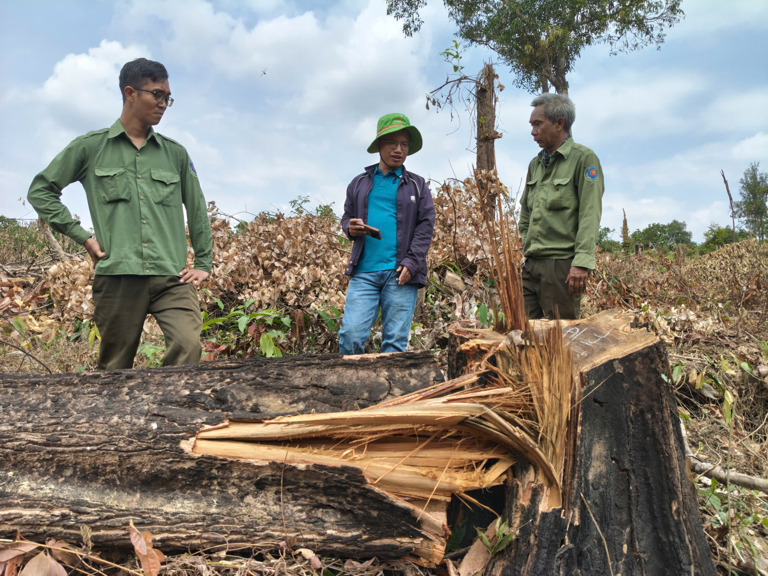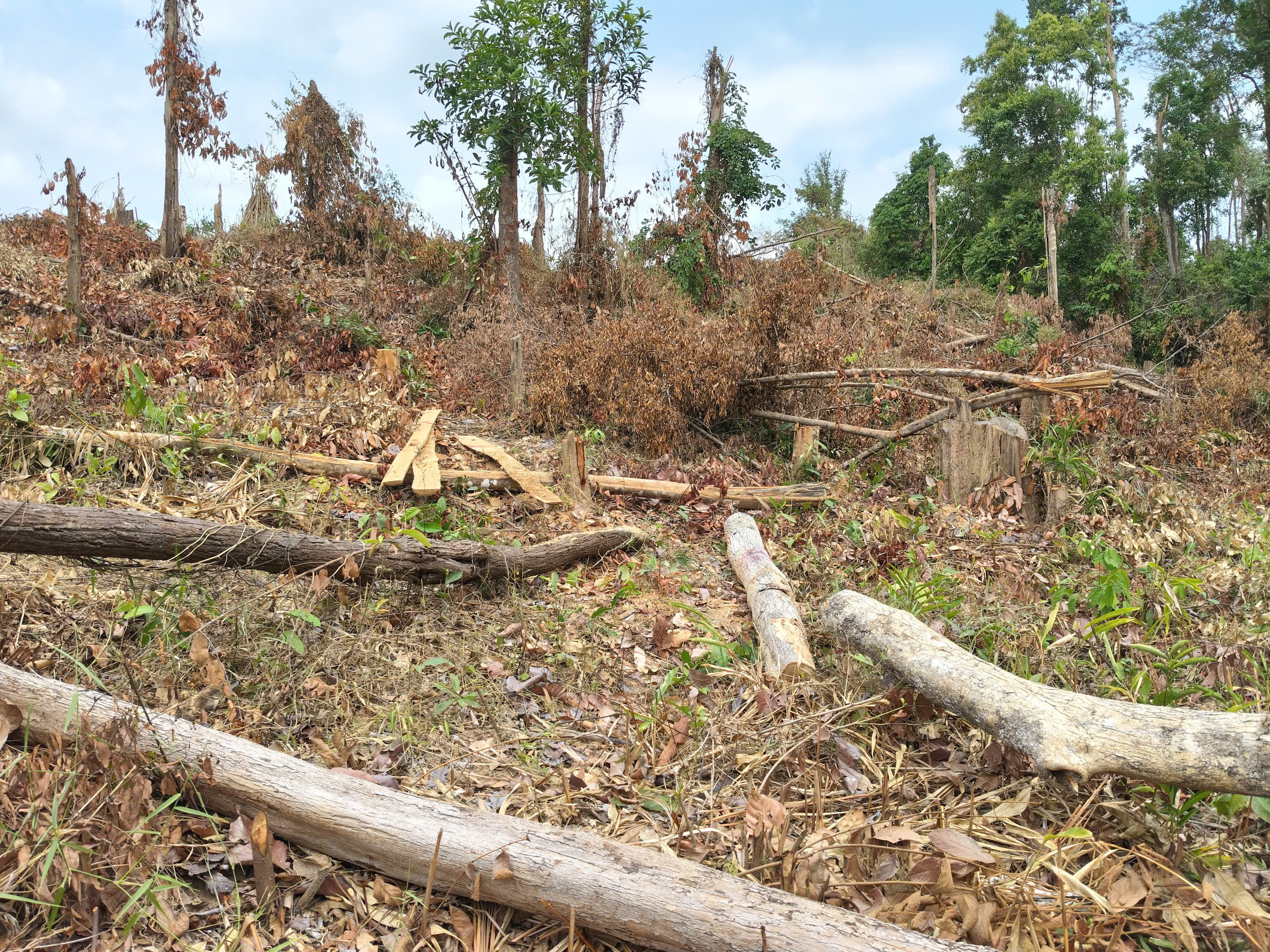 Theo ghi nhận thực tế của phóng viên Báo SGGP tại hiện trường, một khoảnh rừng tự nhiên bị phá trắng, nhiều cây gỗ lớn nhỏ bị cắt hạ, nằm ngổn ngang dưới đất. Nhiều cây gỗ sau khi bị cưa hạ vẫn còn nằm tại hiện trường, một số thân cây gỗ đã bị xẻ hộp và chở đi phần lõi, chỉ còn bìa tại hiện trường.