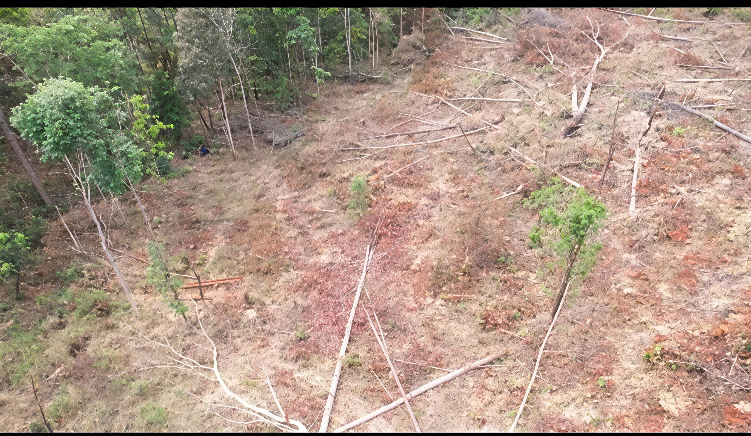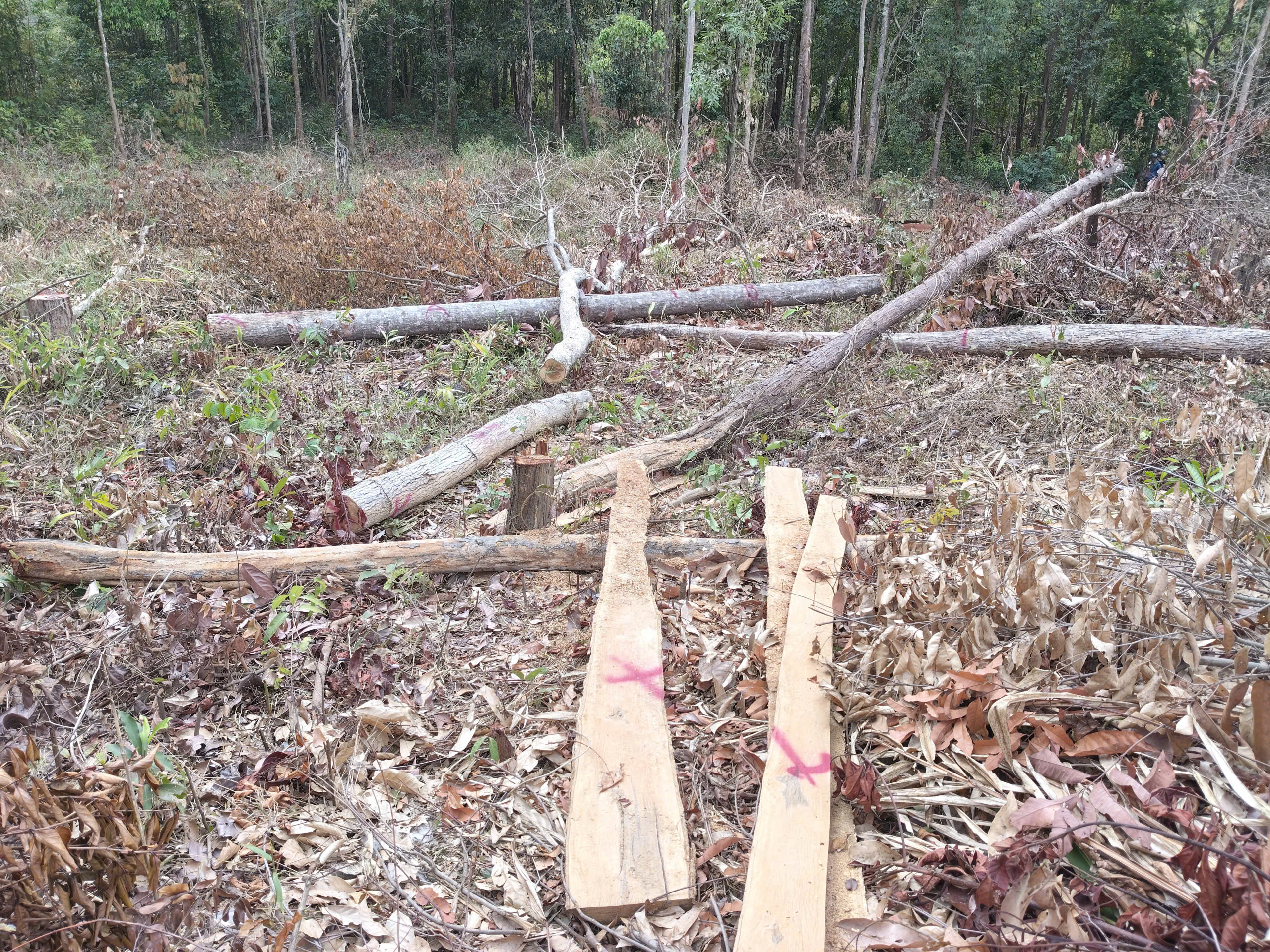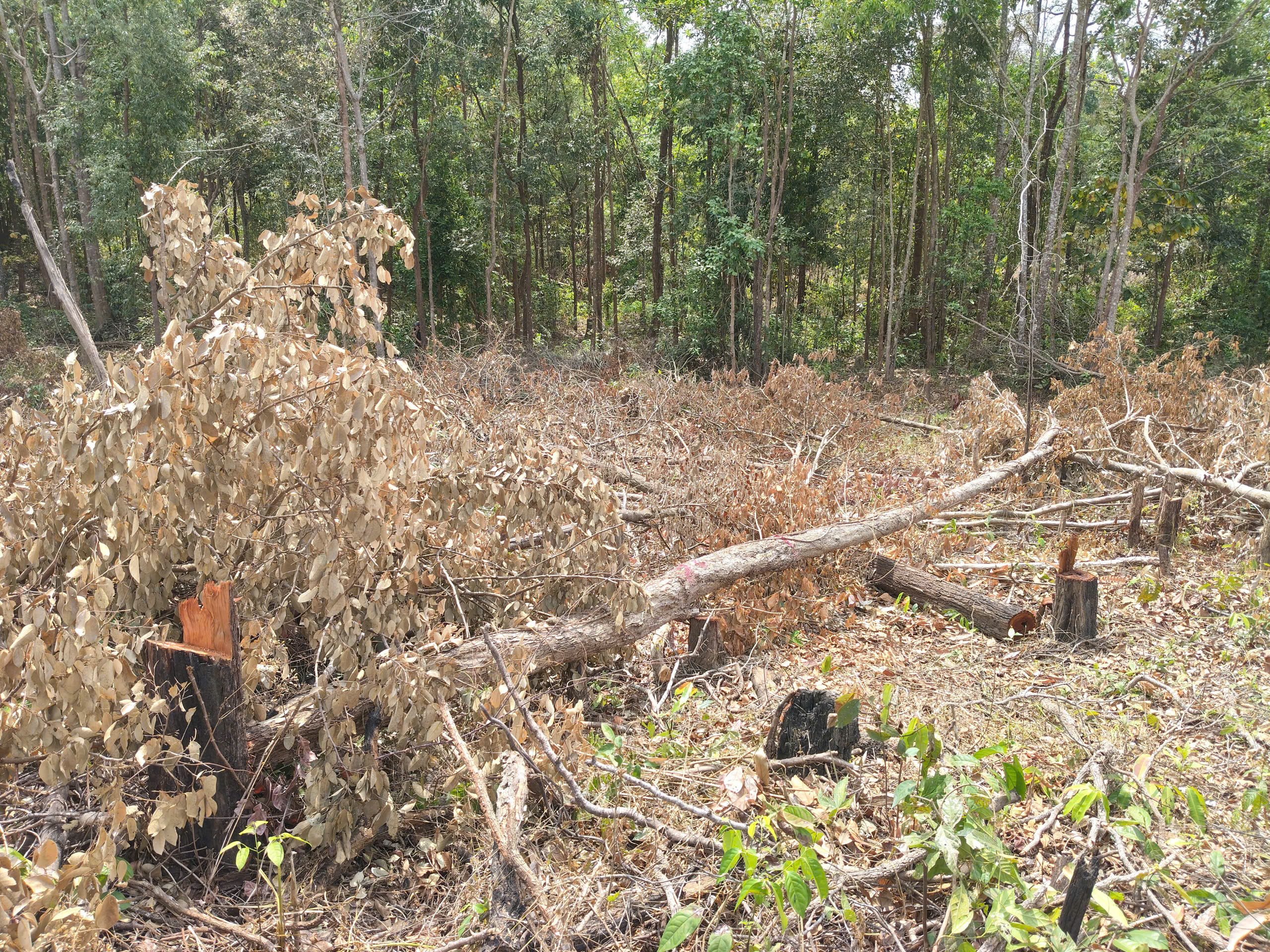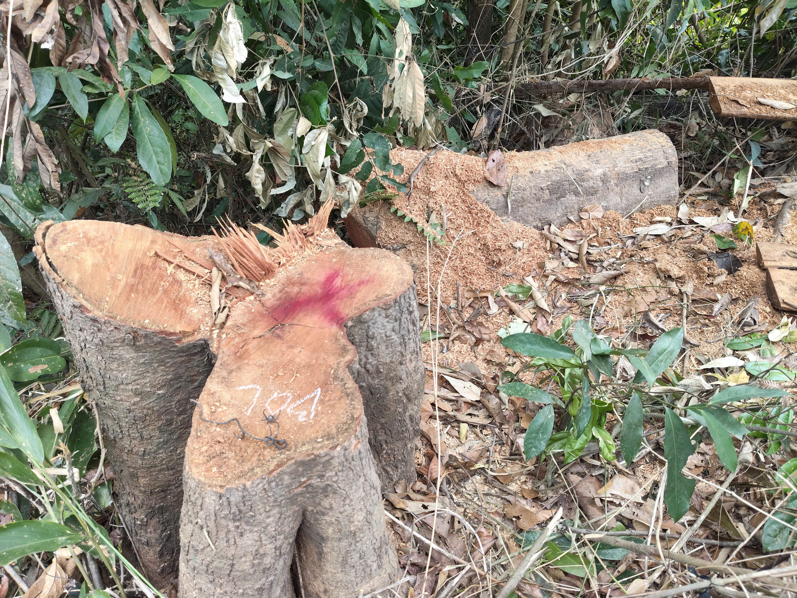 Theo ghi nhận thực tế của phóng viên Báo SGGP tại hiện trường, một khoảnh rừng tự nhiên bị phá trắng, nhiều cây gỗ lớn nhỏ bị cắt hạ, nằm ngổn ngang dưới đất. Nhiều cây gỗ sau khi bị cưa hạ vẫn còn nằm tại hiện trường, một số thân cây gỗ đã bị xẻ hộp và chở đi phần lõi, chỉ còn bìa tại hiện trường.