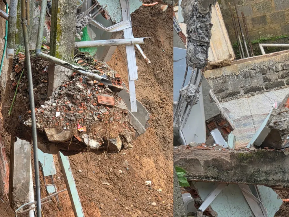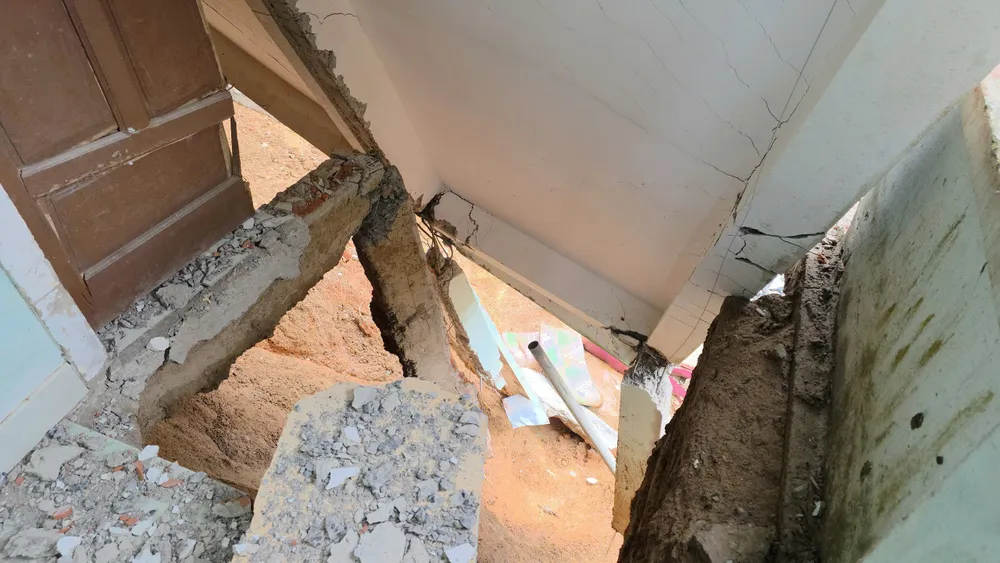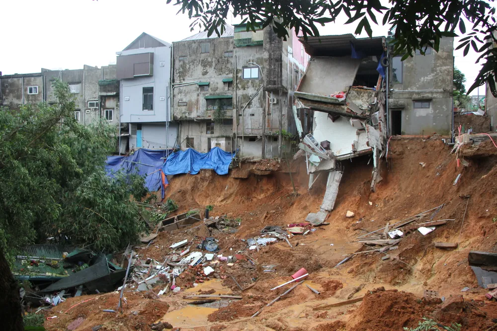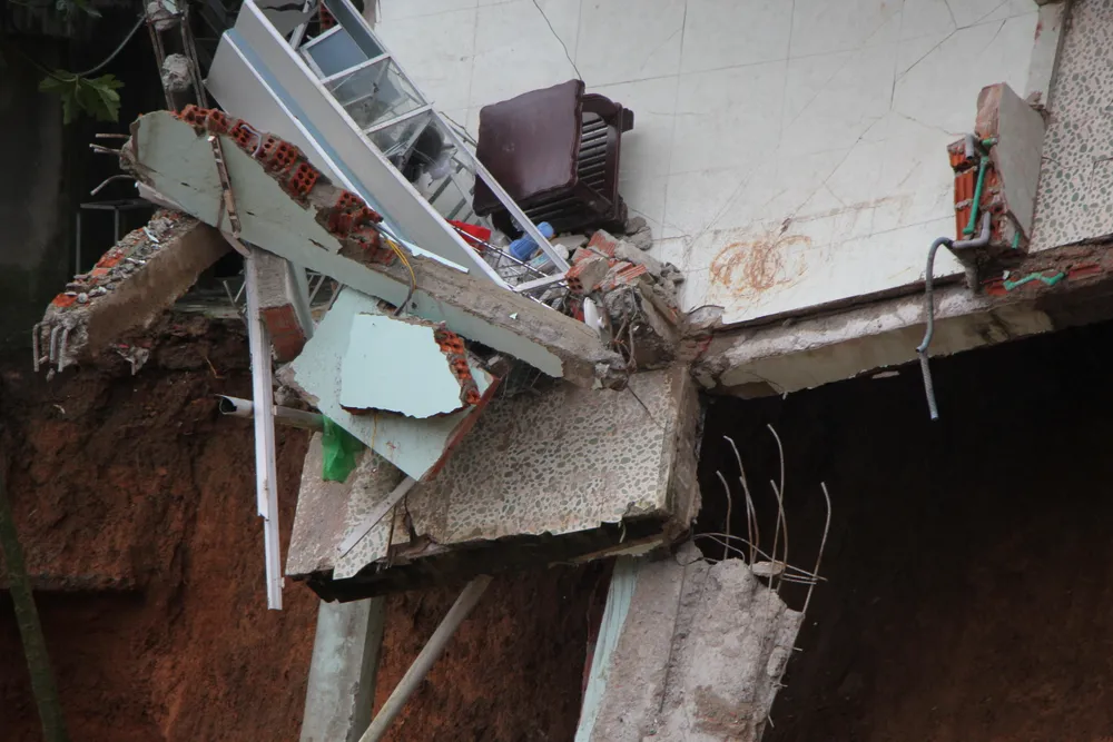 Qua kiểm tra, cơ quan chức năng xác định có một căn nhà hai tầng đổ sập gần một nửa của tầng 1 và tầng 2. Đồng thời, có 9 căn nhà liền kề bị sạt lở móng nghiêm trọng, có thể đổ sập bất cứ khi nào. Ảnh: MINH TRƯỜNG.