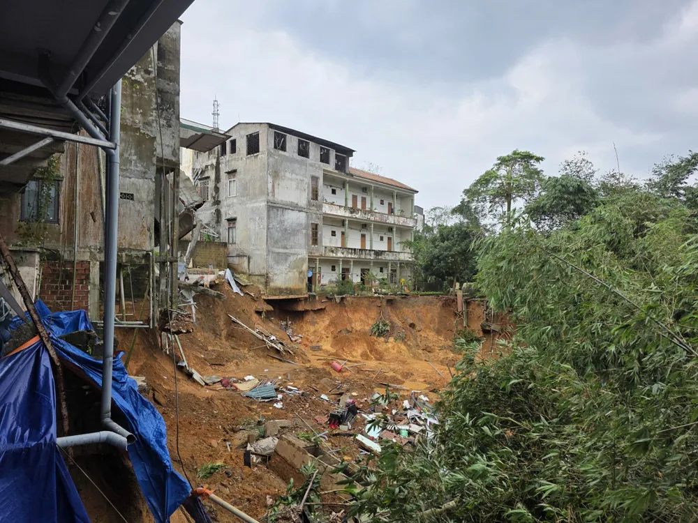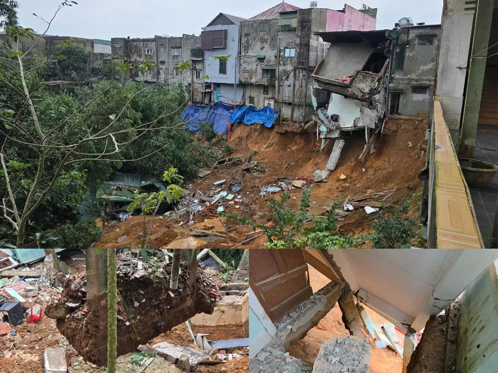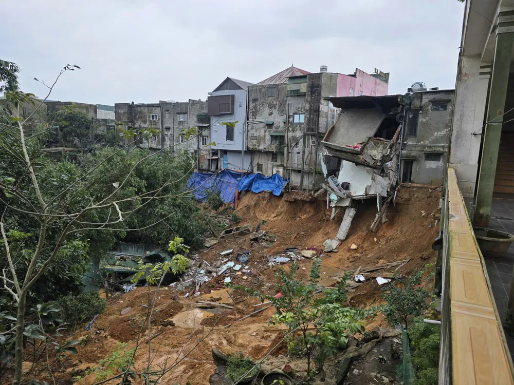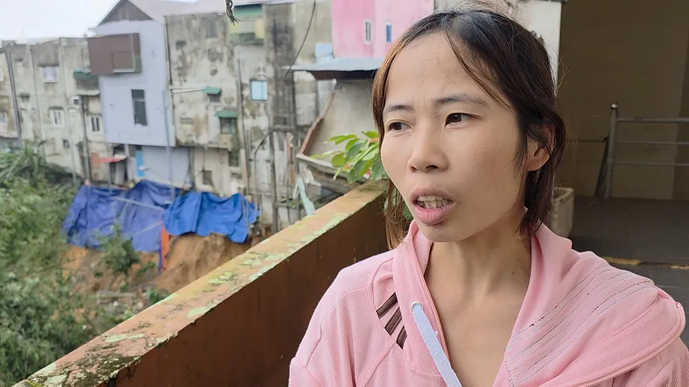 Chị Hoàng Diệu Linh (39 tuổi) chủ khách sạn 4 tầng hãi hùng kể lại, lúc 10 sáng ngày hôm qua, trời có mưa to và gió lớn; bất ngờ nghe tiếng nổ thì chạy ra thấy căn nhà sau lưng đã bị sập đổ hoàn toàn. Tiếp đó, đất đá phía dưới chân móng các nhà xung quanh cũng sụt lún dần nên hô hoán nhau, bồng bế các con bỏ chạy ra đường để đảm bảo an toàn. Ảnh: MINH TRƯỜNG
